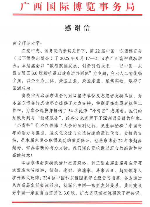 近日,我校收到广西国际博览事务局发来的感谢信,对我校作为第22届中国—东盟博览会(以下简称东博会)的对口接待单位和志愿者支持单位,为其成功举办提供了大力支持表示衷心的感谢,特别是为盛会选拨并输送了54名优秀“小青芒”志愿者。