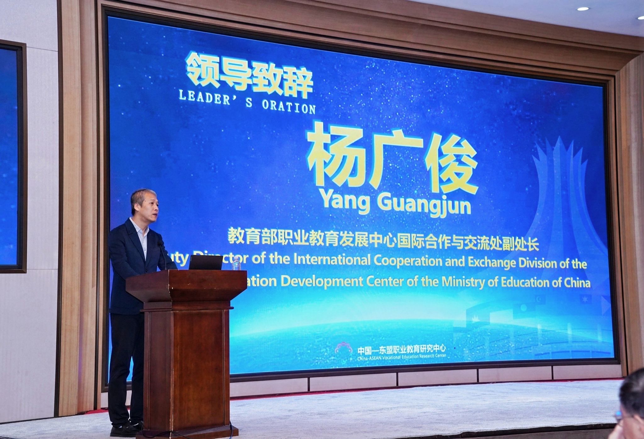 杨广俊在致辞中指出,中国与东盟合作成果丰硕,已结成了最为紧密的共同体。他强调,将中国和东盟互补优势转化为实实在在的发展成果,核心在于人才,而职业教育正是培养这支高素质技术技能人才大军的主阵地。希望各方共绘发展蓝图,强化战略对接,推动职业教育合作更深融入中国—东盟命运共同体建设,实现各国职业教育与区域整体发展协同并进;共建标准体系,推动互联互通,探索合作机制,打破人才发展壁垒;共创产教融合,服务产业升级,构建更为紧密的校企命运共同体;共破数字疆域,赋能社会教育,携手建设中国—东盟职业教育数字化资源平台,共同探索利用大数据、人工智能技术开展个性化学习和智慧管理;共筑人文交流,厚实友好根基,扩大师生交流规模,深化语言+技能的合作模式,开展职业技能大赛、文化交流活动,让职业教育合作成为连接中国与东盟青年心灵的桥梁。