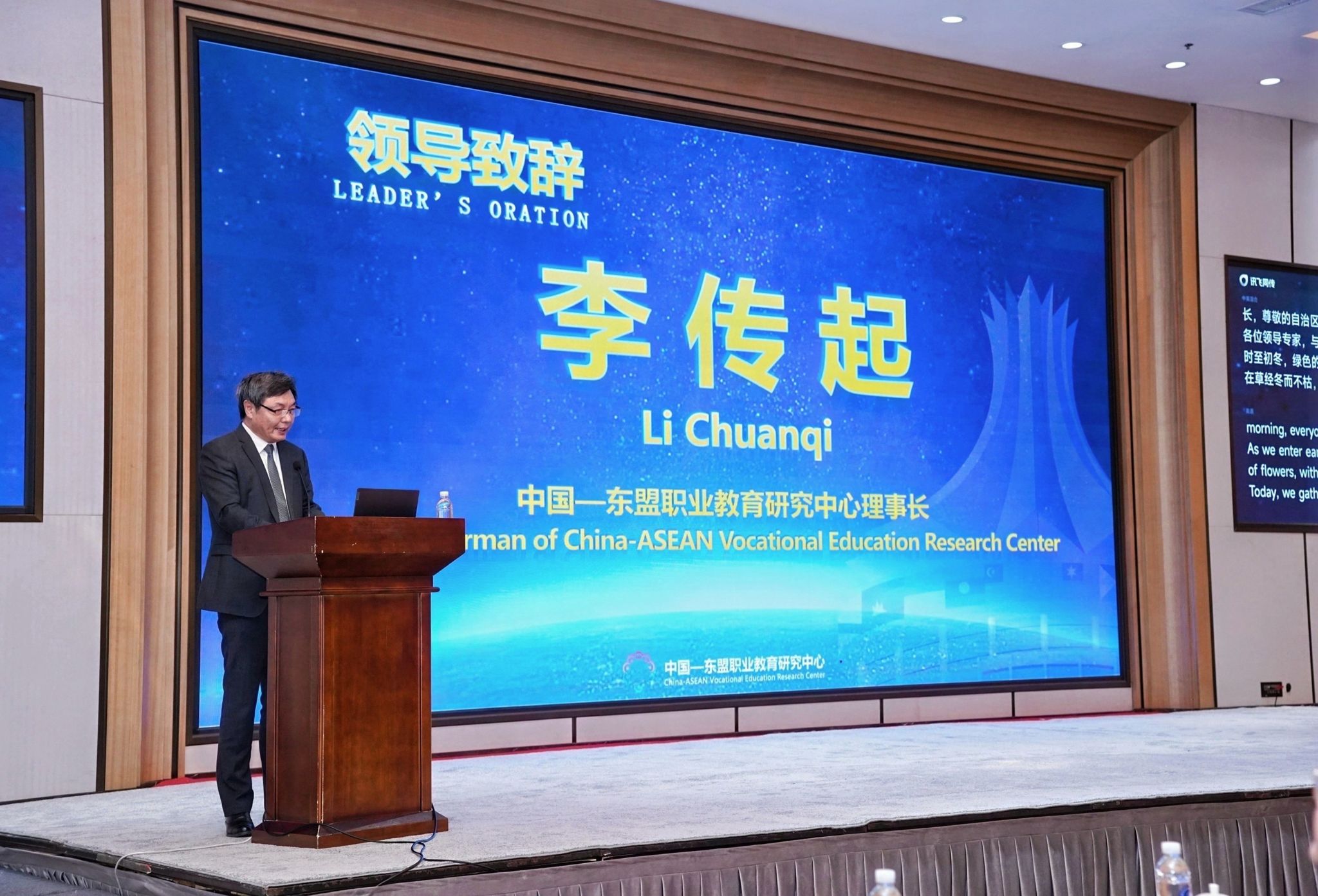李传起代表中心致开幕词。他简要介绍了中国—东盟职业教育研究中心的基本情况和发展成效,阐明了职业教育数字化转型浪潮下,中国—东盟职教合作的重要意义与未来方向。