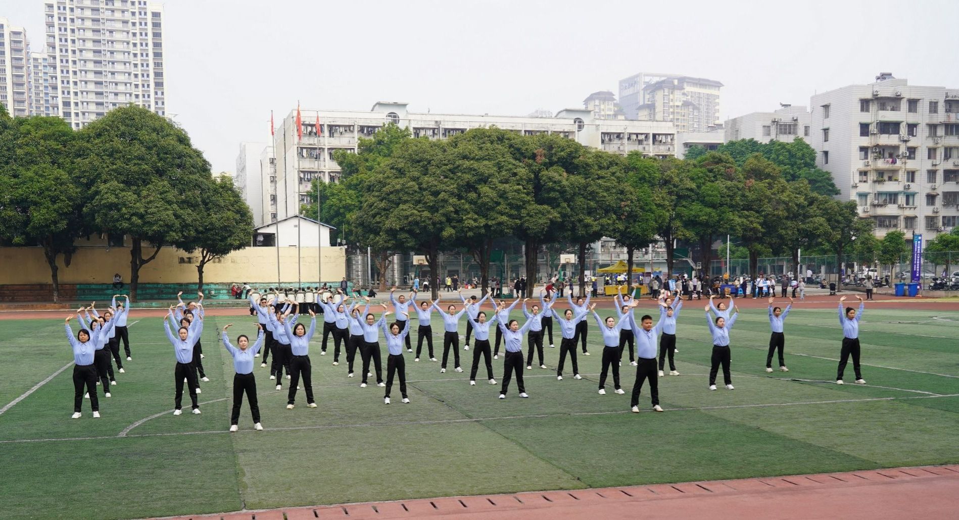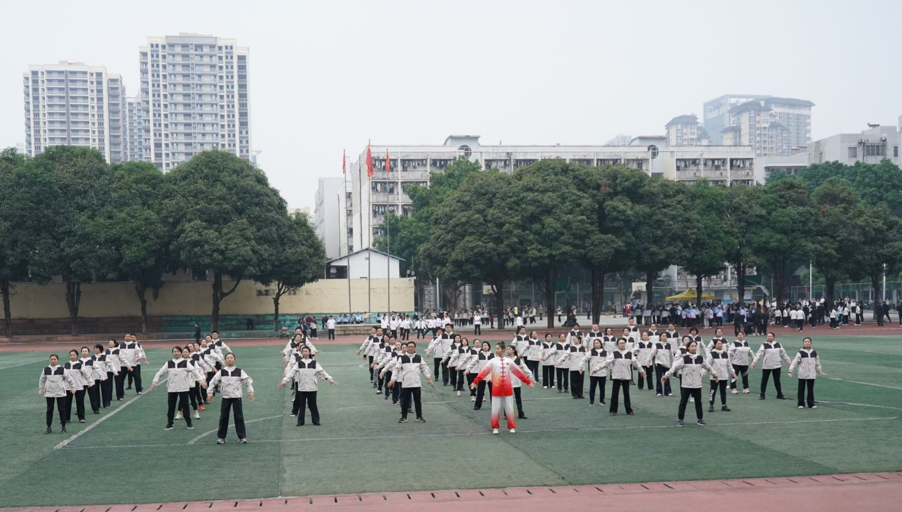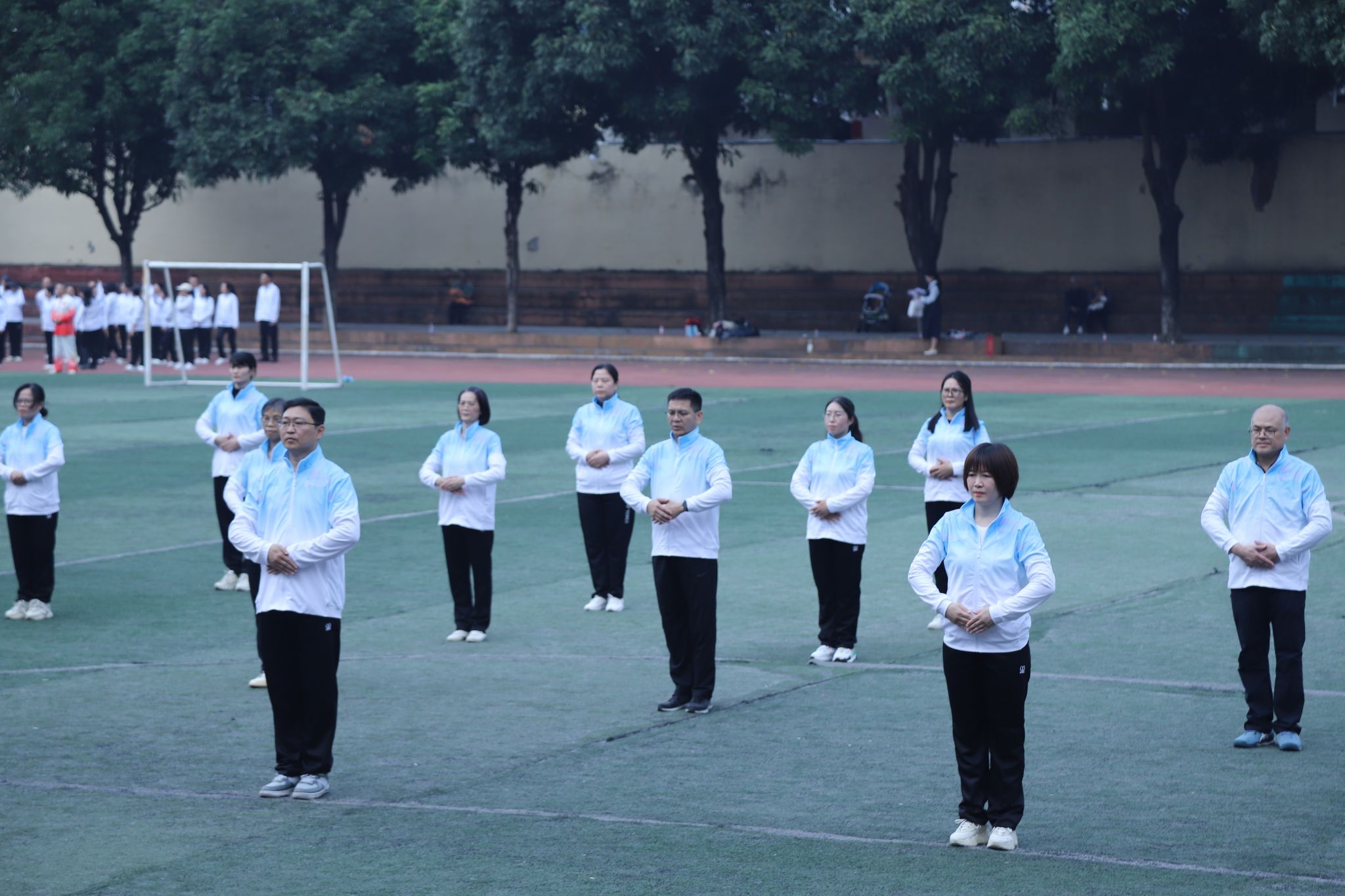 12月7日,南宁师范大学教职工健身气功八段锦比赛在明秀校区足球场顺利举行。本次比赛由校工会组织,35个分工会近1200余名教职工报名参加。