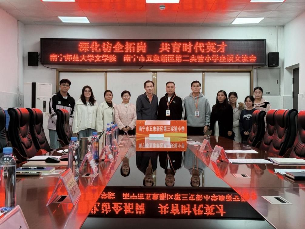 为深化高校与基础教育学校的对接合作,拓宽毕业生就业渠道,12月17日上午,南宁师范大学文学院党委副书记吴幼坚、副院长张淑云一行前往南宁市五象新区第三实验小学,开展“深化访企拓岗 共育时代英才”主题座谈交流。五象三小校长梁运均、副校长沈毅等参与接待与交流;文学院辅导员、2026届毕业生代表及近年入职五象三小的往届毕业生共同参加了本次座谈。