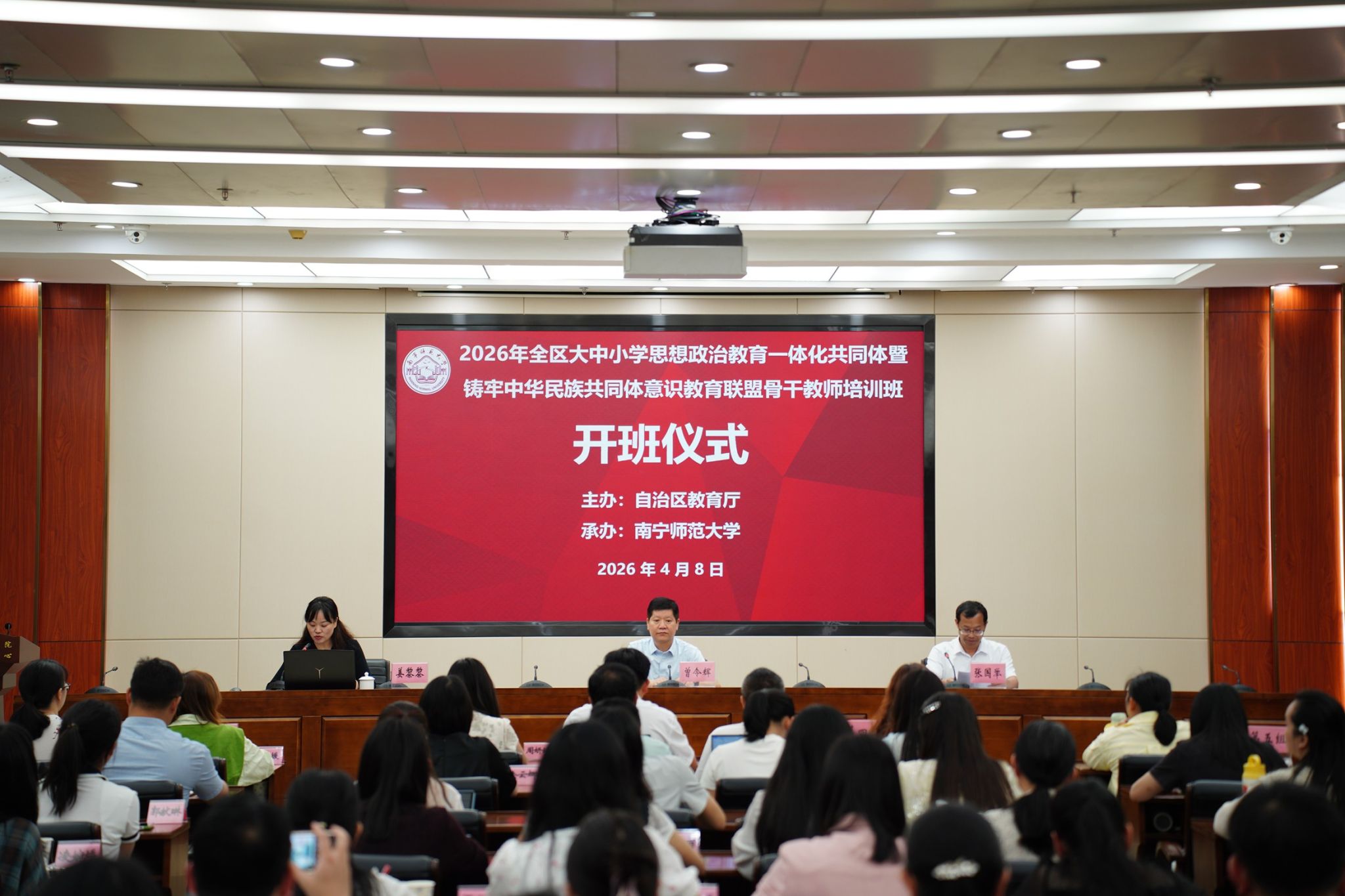 为深入学习贯彻习近平总书记关于教育的重要论述,推进大中小学思想政治教育一体化建设,将铸牢中华民族共同体意识全面融入立德树人全过程,4月9日至11日,由广西壮族自治区教育厅主办、南宁师范大学承办、广西干部学院协办的2026年全区大中小学思想政治教育一体化共同体暨铸牢中华民族共同体意识教育联盟骨干教师培训班在广西干部学院顺利开班。我校马克思主义学院院长曾令辉、广西干部学院院长张国举出席开班仪式并致辞。