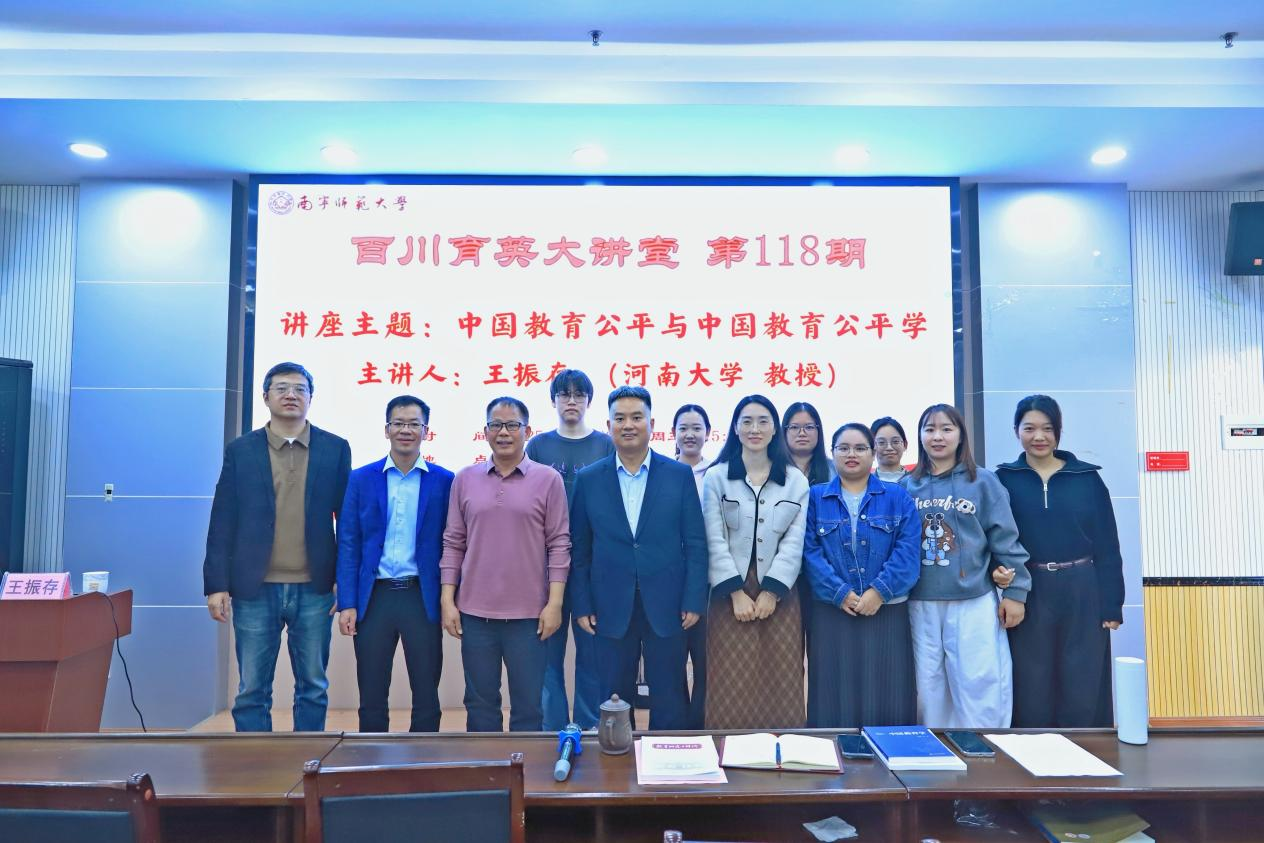 11月26日,由南宁师范大学教育科学学院主办、广西教育现代化与质量监测研究中心承办的第118期《百川育英大讲堂》讲座在五合校区理综楼北1003室顺利举行。本次讲座特邀河南大学王振存教授,以“中国教育公平与中国教育公平学”为主题展开深入分享,由教育科学学院党委书记余朝文教授主持。
