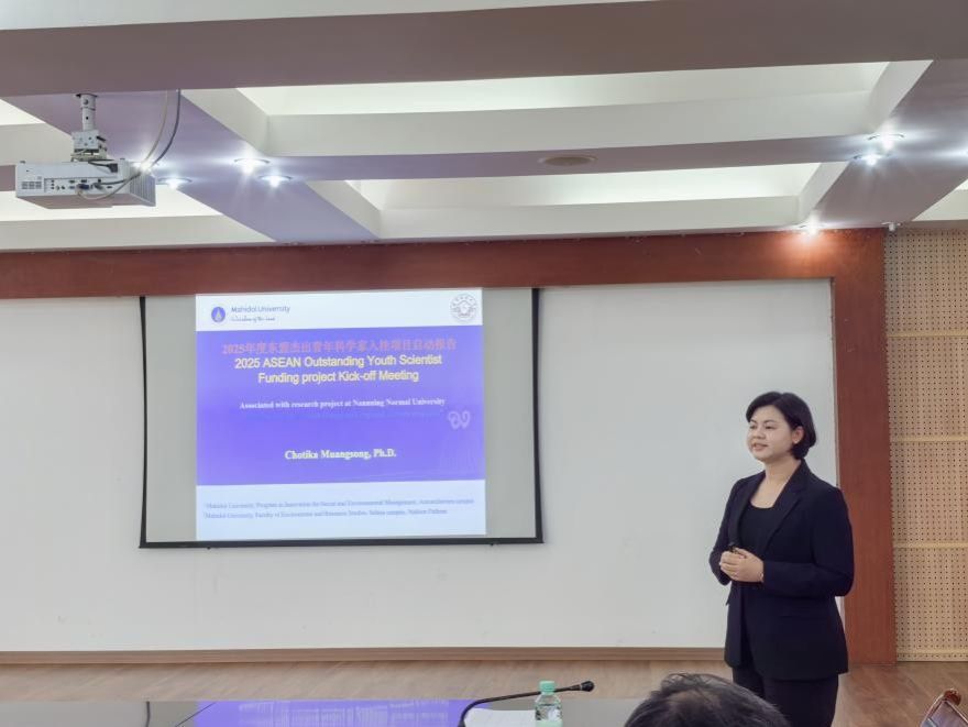 广西科技厅东盟技术转移中心国际合作部项目主管在致辞中,对Chotika Muangsong博士入桂开展科研工作表示欢迎,并强调东盟青年科学家入桂项目对深化中国—东盟科技交流合作、汇聚区域青年创新人才具有重要意义。科研处、国际交流合作处、地理与海洋研究院负责人对此项目进行表态发言。项目合作负责人就项目背景、合作意义及预期目标作了简要介绍。东盟杰出青年科学家泰国玛希隆大学Chotika Muangsong(乔奥玛)详细介绍了该项国际合作项目的研究内容、技术路线、研究计划及预期目标,并表达了对在南宁师范大学开展合作研究的信心与期待。