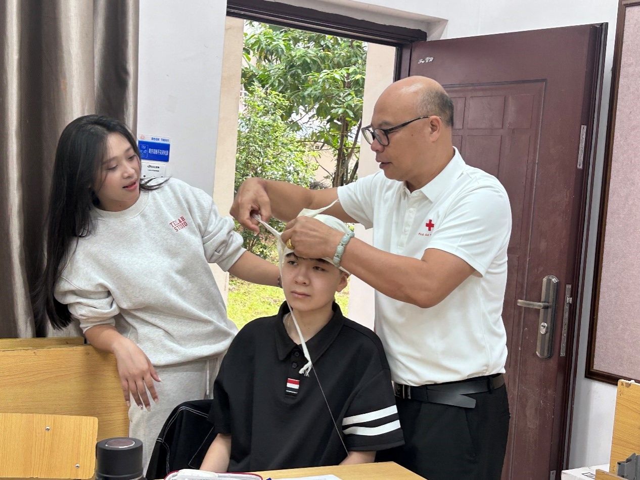 实操训练环节气氛热烈、互动频繁。在心肺复苏练习中,学员们分组在模拟人上进行按压与人工通气练习,教师逐一纠正动作,强调“手臂垂直、频率达标”。创伤救护课上,学员们两人一组,互相扮演伤员与施救者,认真练习头部包扎、手臂固定等技能。来自越南的学员在教师指导下反复调整绷带松紧,力求操作规范、有效。