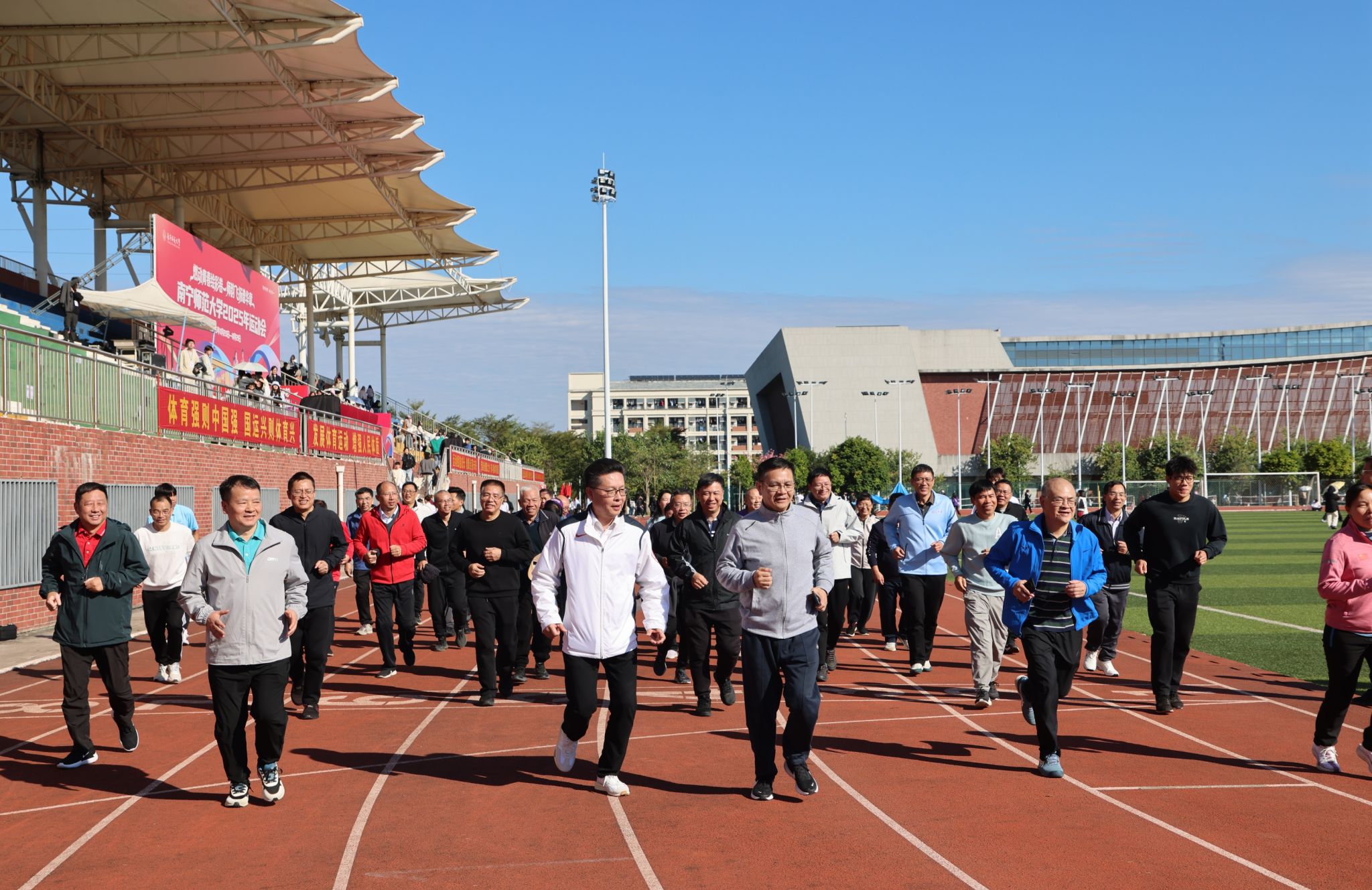 开幕式结束后,校领导带领处级干部在田径场上开展南宁师范大学2025年校园健康跑启动仪式,并绕田径场进行400米健康跑。