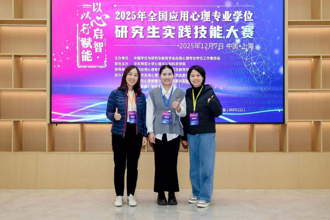 12月6日至7日,2025年全国应用心理专业学位研究生实践技能大赛(决赛)在华东师范大学普陀校区顺利举行。我校教育科学学院2025级应用心理专业黄美幼同学荣获心理咨询面谈技能比赛二等奖;2024级应用心理专业王雯萱和韦秋萍同学荣获应用心理案例开发比赛三等奖,2024级应用心理专业硕王琪琪、白心怡和熊敏同学荣获心理科普作品创作比赛三等奖。
