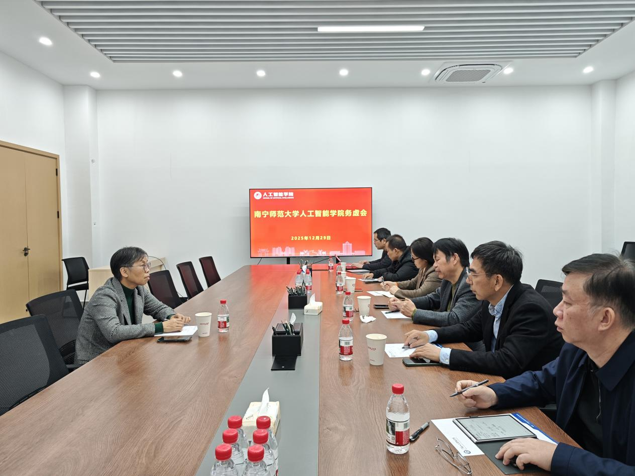 随后,李美清现场主持召开南宁师范大学人工智能学院工作务虚会。在听取学院班子成员依次汇报学院发展情况和工作计划后,李美清提出:一是立足本校,深耕“AI+教育”融合发展。要充分发挥学科优势,加强与校内相关学院的协同联动,聚焦学校教育教学核心需求,在智慧课堂建设、教育大数据分析、个性化教学赋能等领域持续发力,推动“AI+教育”应用走深走实,切实提升育人质量与办学内涵。二是立足本地,赋能区域产业智能升级。要主动对接武鸣区经济社会发展需求,深度挖掘“AI+产业”创新增长点,聚焦交通出行智能化管理等民生关键领域,组建专项研发团队,推动人工智能技术成果落地转化,助力地方治理能力提升。三是立足广西,打造特色办学品牌名片。要加强学院办学成果、文化特色与创新亮点的梳理总结,搭建多元化成果展示平台,充分展现学院办学实力与精神风貌,打造具有辨识度、影响力的人工智能应用品牌,为学校提升区域知名度与影响力贡献力量。