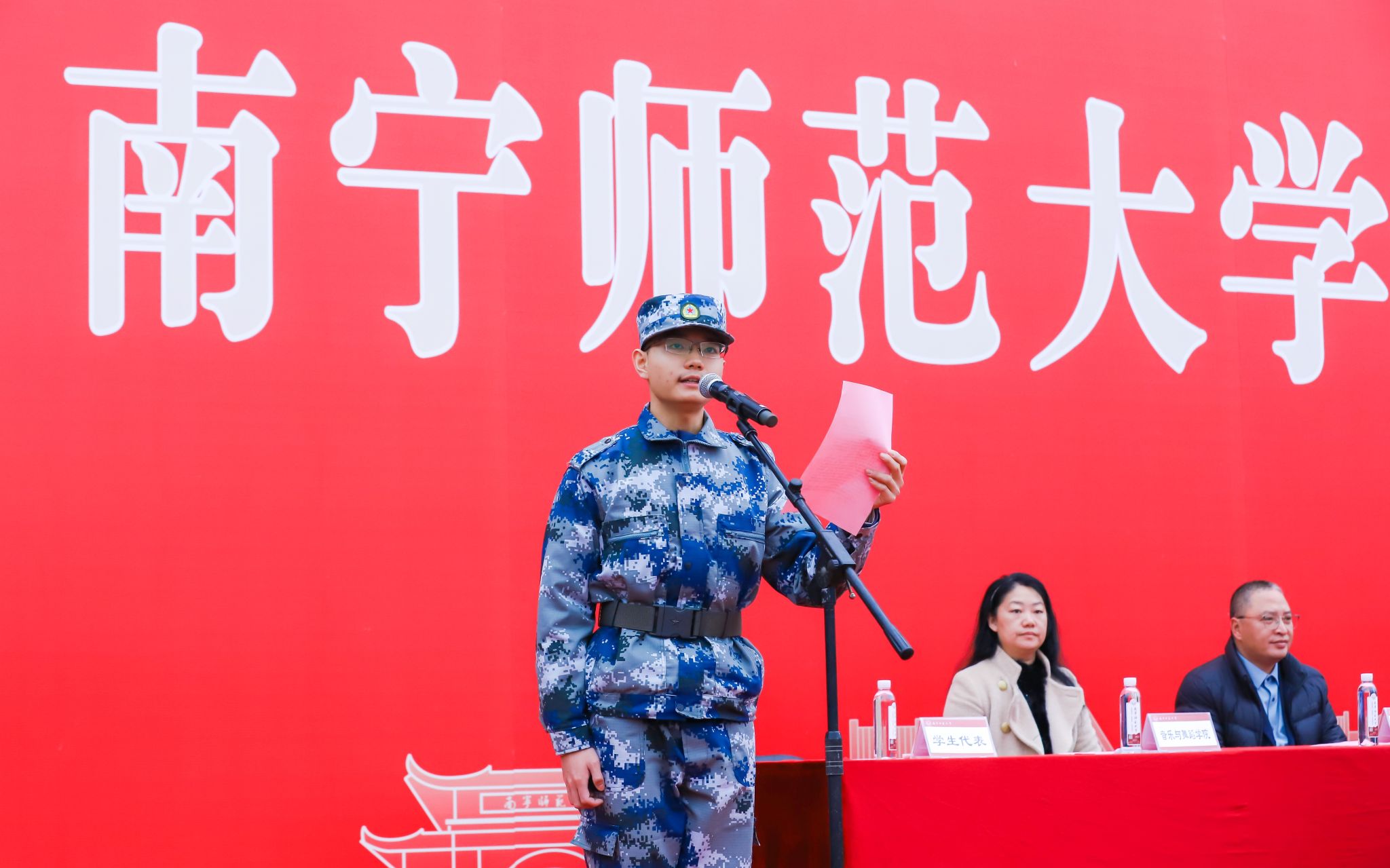 1月5日上午,我校2025级学生军训动员大会在五合校区和武鸣校区同时举行。学校副校长梁家斌、龙妮娜,承训单位代表,学校相关职能部门、教辅部门、各学院负责人以及2025级6482名军训学生参加大会。