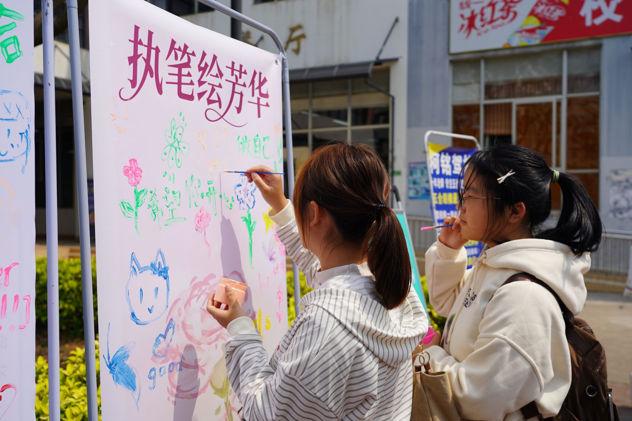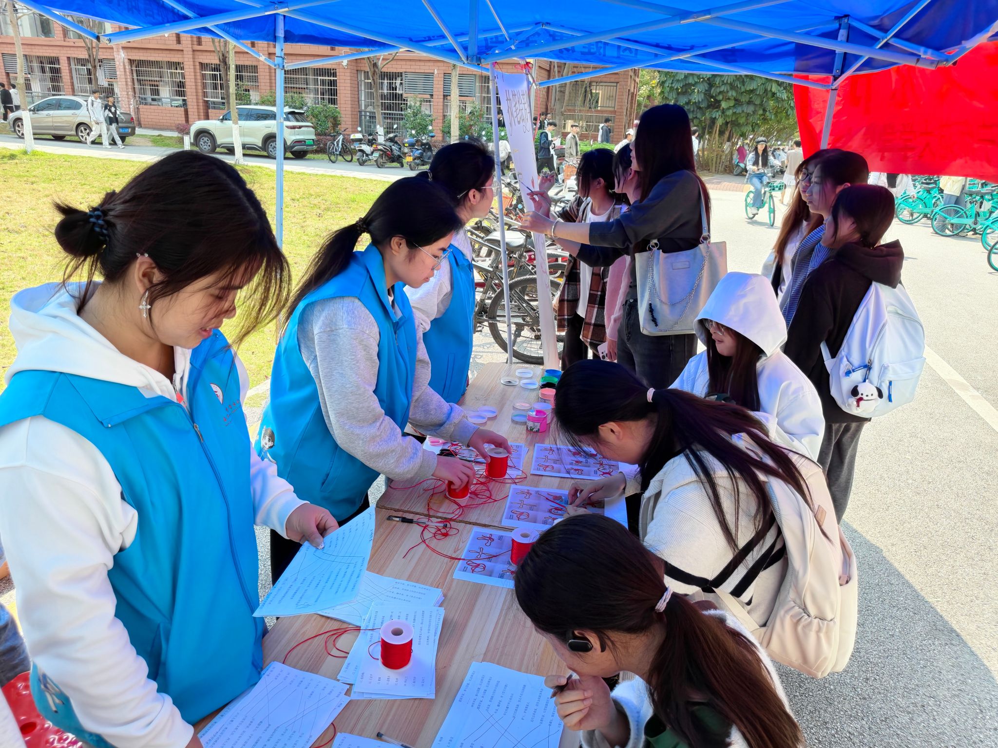 本次活动采取线上线下相结合的方式开展,线上面向全校同学征集“觉得这个瞬间有力量”的照片与故事,让这些瞬间传递温暖与力量。大家分享了市井中肩挑鲜蔬、赛场上奋力腾跃等多个瞬间,通过用生动的画面与真挚的文字,诠释了女性温柔而磅礴的力量。硬笔书法作品大赛与电子海报设计大赛共收到作品近百份,包含赞颂女性力量的诗歌书法、致敬女性榜样的创意海报等佳作。线下设置现场绘画接力、心语互赠、女性成就配对及DIY中国结等互动环节,传递对女性的崇高敬意与美好祝福。当学生完成任意两个任务后,即可领取鲜花赠予校内女性教职员工或女同学。多支鲜花送到老师、宿管阿姨、食堂阿姨及女同学手中,校园洋溢着脉脉温情。此外,校学生会在三个校区设立“卫生巾互助盒”,为有需要的女生提供帮助,累计服务超过500人次,进一步弘扬关爱互助的校园风尚。