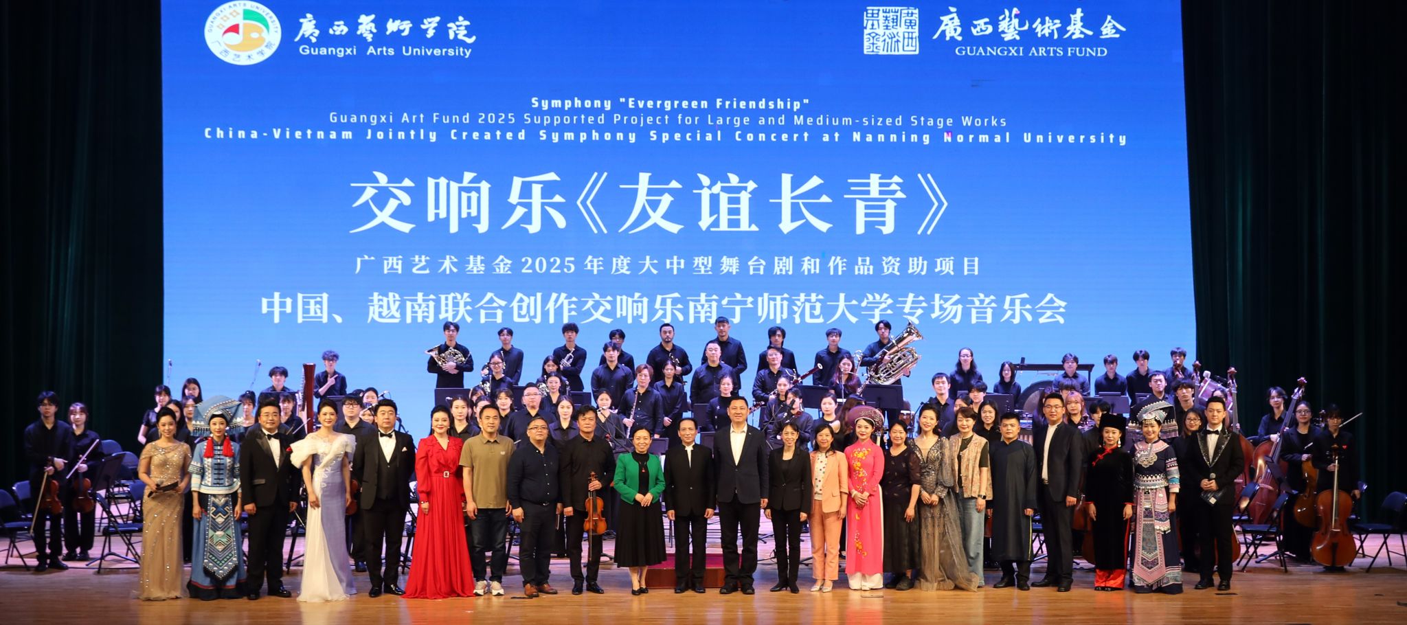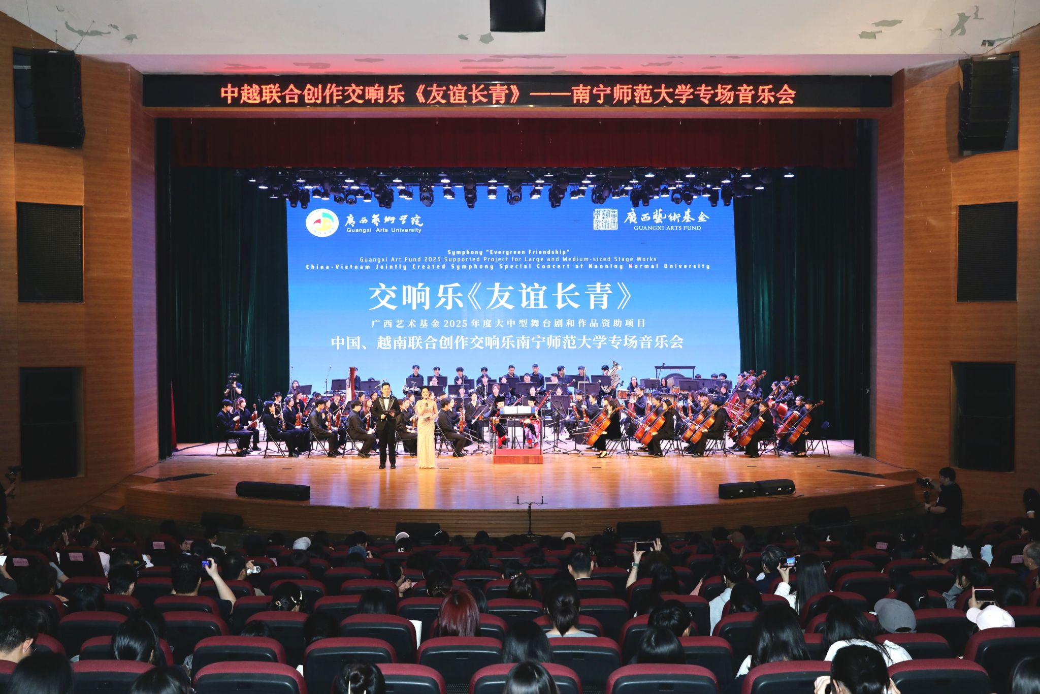 交响乐《友谊长青》是广西艺术基金2025年度大中型舞台剧和作品资助项目,由广西艺术学院联合越南国家文联等机构策划打造,是中越作曲家携手创作的首部同主题、同体裁大型交响乐作品。音乐会分为《共饮一江水》《岁月弦歌》《文脉同行》《友谊长青》四个篇章,分别对应中越的地理、历史、文化、未来四个维度,通过音乐语言描绘了两国山水相依的地理联结、文脉相融的深厚渊源,回顾了两国人民并肩前行的奋斗历程,彰显了新时代中越文化互鉴互融的时代风采。广西特色乐器啵咧、天琴、马骨胡、铜鼓与越南独弦琴、竹琴等越南乐器巧妙交融,将“西为中用”的创作理念展现得淋漓尽致。北仑河、三月三等独特元素贯穿其中,生动诠释了中越两国的深厚情谊,演出赢得了现场师生热烈的掌声。