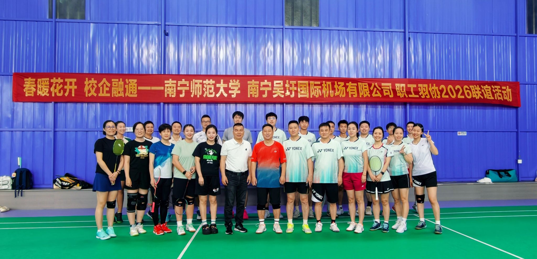 活动伊始,学校副校长张松涛与南宁吴圩国际机场有限公司祁振兴总经理进行了交流。他指出,此次联谊活动是学校落实拓岗就业、创新校企合作形式的重要举措,旨在以球会友、拉近校企距离,为后续深化合作,培养高质量人才、拓展实习就业新路径奠定坚实基础。随后,双方按照混合团体赛的形式进行了羽毛球友谊赛。