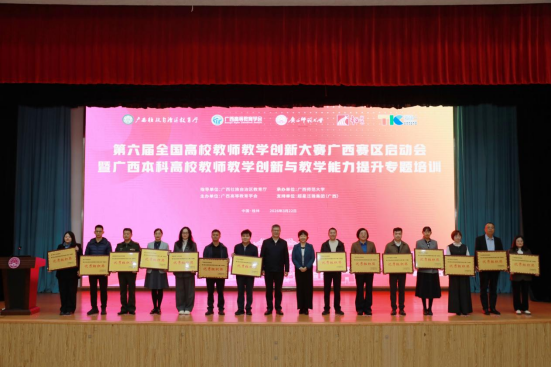 3月22日,第六届全国高校教师教学创新大赛广西赛区启动会暨广西本科高校教师教学创新与教学能力提升专题培训在广西师范大学育才校区顺利举行。会上,主办方对第五届全国高校教师教学创新大赛广西赛区优秀组织奖获奖单位予以表彰,我校教师团队在本届大赛中表现优秀,10支团队入围区赛,共有7支团队获奖,其中,获一等奖1项、二等奖4项、三等奖2项,我校凭借出色的赛事组织与参赛表现获评该奖项。