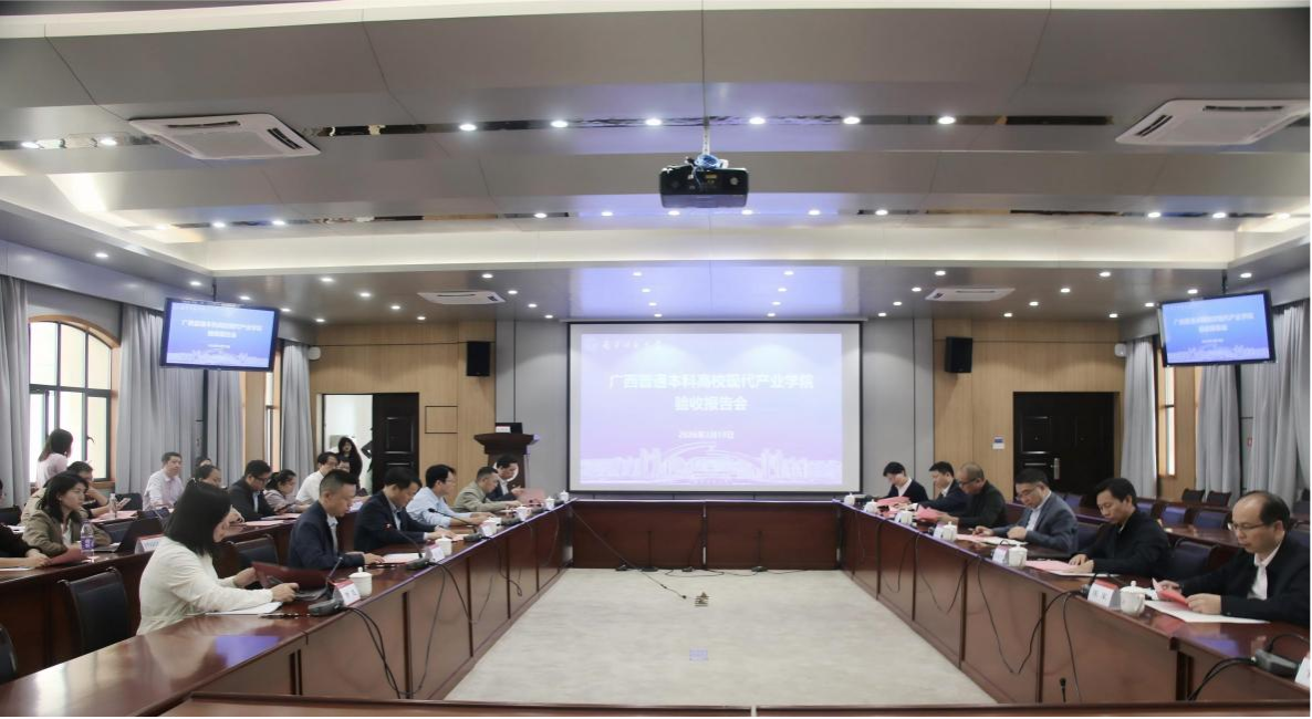 卢远代表学校对专家组的莅临表示热烈欢迎,介绍了学校的办学历程、学科建设成果及产教融合情况,重点介绍了学校以产业需求为导向,整合资源推进3个示范性现代产业学院建设的进展与成效。卢远强调,此次验收工作是推动产业学院内涵提质的重要契机,相关部门、学院要充分吸收专家组的意见建议,持续深化产教融合、科教融汇,不断创新现代产业学院管理体制和育人模式,进一步提升产业学院服务区域产业发展的能力,以高质量的办学成果助力新时代壮美广西建设。