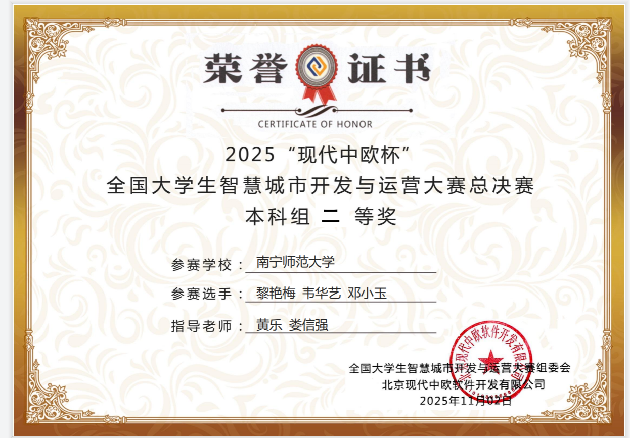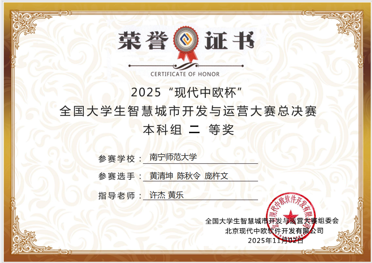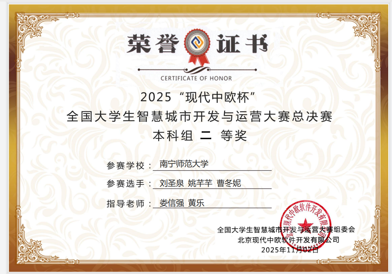 2025年11月1日,我校自然资源与测绘学院房地产开发与管理专业学生参加了2025“现代中欧杯”全国大学生智慧城市开发与运营大赛全国总决赛,由娄信强主任,黄乐老师,许杰老师指导的3支队伍在本次比赛中表现卓越,荣获全国二等奖3项。