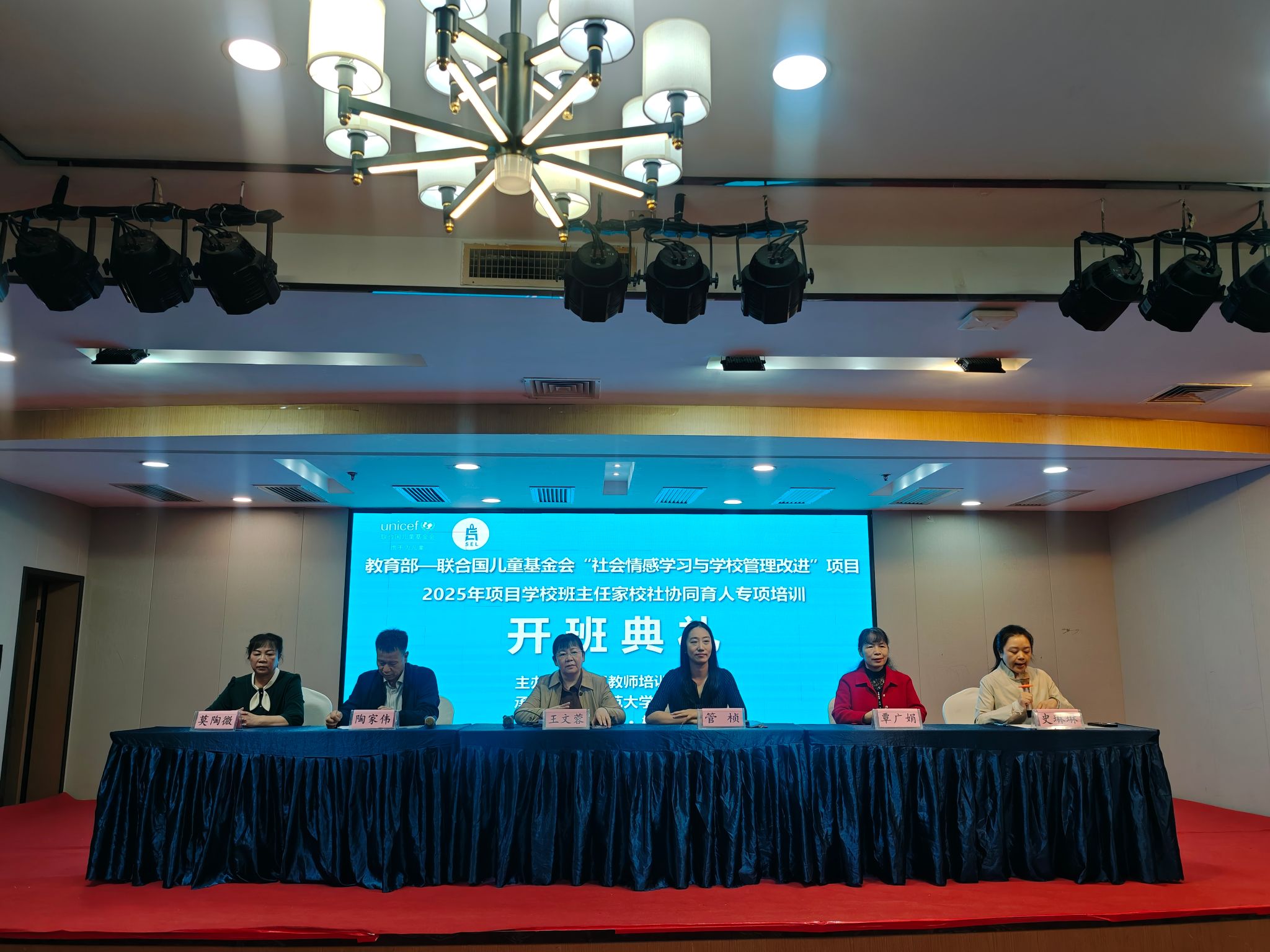 2025年11月6日上午,教育部—联合国儿童基金会“社会情感学习与学校管理改进”项目2025年项目学校班主任家校社协同育人专项培训在柳州正式启动。我校教师教育学院院长王文蓉,联合国儿童基金会顾问管帧、柳州市教师发展学校校长陶家伟等领导专家出席。来自玉林市容县、河池市环江县等地的项目负责人、县级专家及参训教师参加。开班仪式由自治区项目执行办史琳琳老师主持。