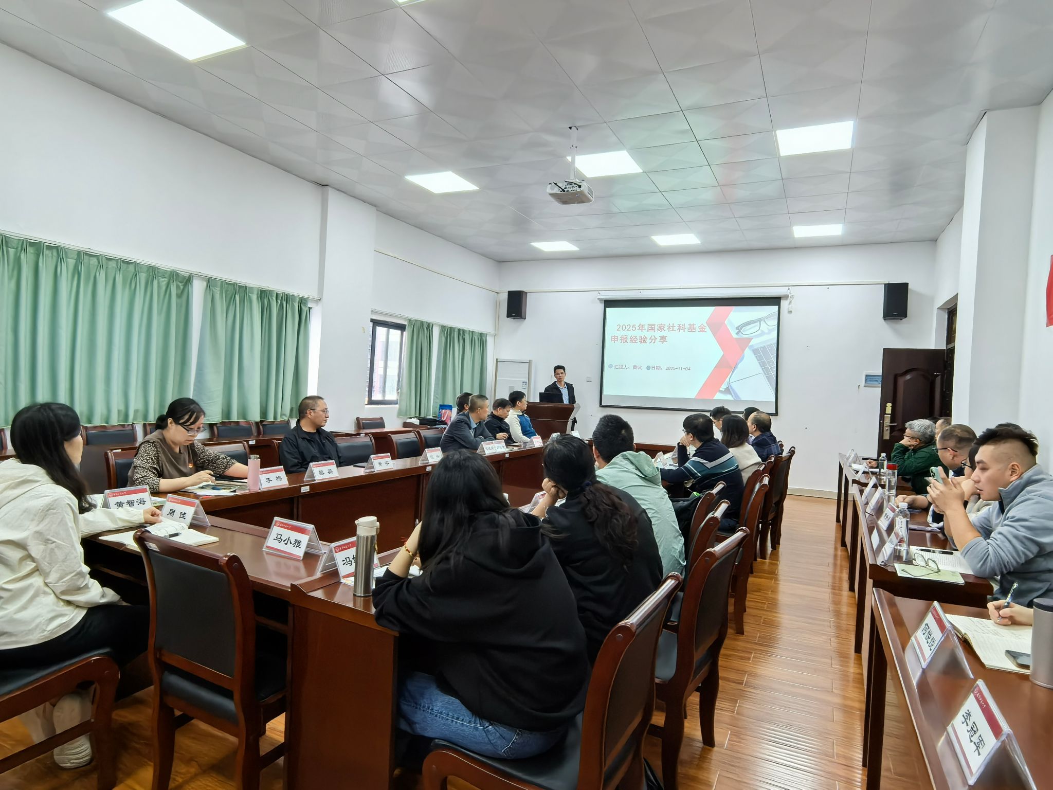 动员会上首先邀请了2025年度国家社科基金项目获得者黄武博士结合自身申报经历,从选题来源、研究设计、申报注意事项等方面分享了申报经验。刘新全副院长在动员讲话中强调,国家基金项目是学院学科建设与科研水平提升的重要支撑,同时也是高校教师自身研究水平的体现,要求全体专任教师以“瞄准前沿、突出特色、强化创新”为原则,以高度的责任感投入到国家两基项目申报工作中,学院将以“有组织的科研”为主线,全力做好资源保障,优化资源配置与过程管理,力争在2026年申报中实现立项数量与质量双突破。