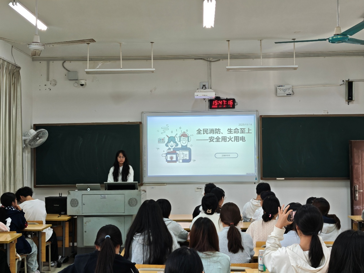 班会上,各班级重点围绕校园用火用电中存在的风险隐患展开讲解,包括违规使用大功率电器、私拉乱接电线、宿舍区域易燃物堆放等问题,引导学生识别常见安全隐患,增强防范意识。23级广告专升本班围绕“校园用火用电风险隐患”“安全用火用电规范”“火灾应急处置方法”三大主题,组织同学们开展消防安全专题学习。23级广电班则聚焦消防知识科普,通过系统讲解全国消防日的设立背景与历史沿革,向同学们普及了消防设施功能、火场自救技巧等基础常识。
