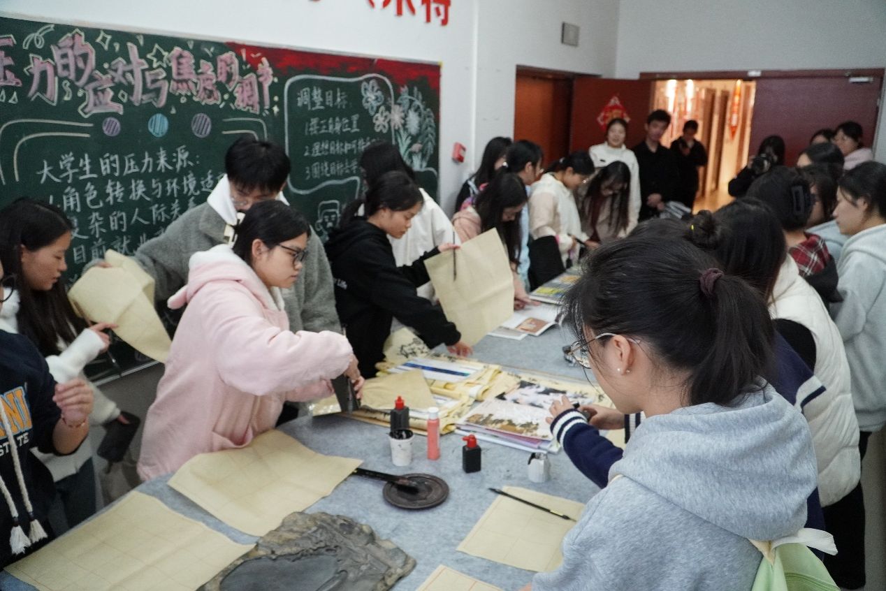 活动伊始,参观者在领队引导下进行参观,梦想会客厅内,工作人员设置互动环节,参观者积极参与并获得纪念小礼品;桂品文创梦工场里,独具学院特色的文创产品琳琅满目,展现传统文化与现代创意的碰撞,吸引了众多参观者;戏文专业实训室内,专业设备与舞台布景齐全,向参观者展示了专业的教学实践条件;劳动实践基地百草园里,植株绿意盎然;学院文化长廊里,记录和梳理着文学院的发展脉络。在“三味书屋”,参观者们提笔蘸墨,在宣纸上体验创作的乐趣,体悟中华文化的深厚内涵和文字艺术的独特魅力。书画展,参观者们近距离观赏各类优秀的书画作品,感受文字与艺术深度融合。