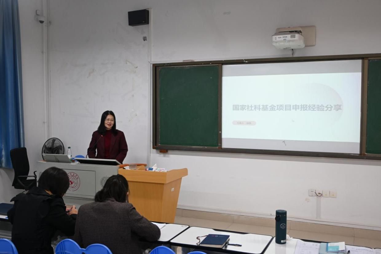 本次沙龙特邀具有国家社科基金项目申报成功经验的胡惠副教授担任主讲。胡老师结合自身申报经历,从选题设计、论证逻辑、申报书撰写等各方面,系统分享了宝贵的申报“实战”经验。随后,她详细解读了国家社科基金的申报流程与政策要点,帮助在场教师全面了解项目申报的具体环节与注意事项。