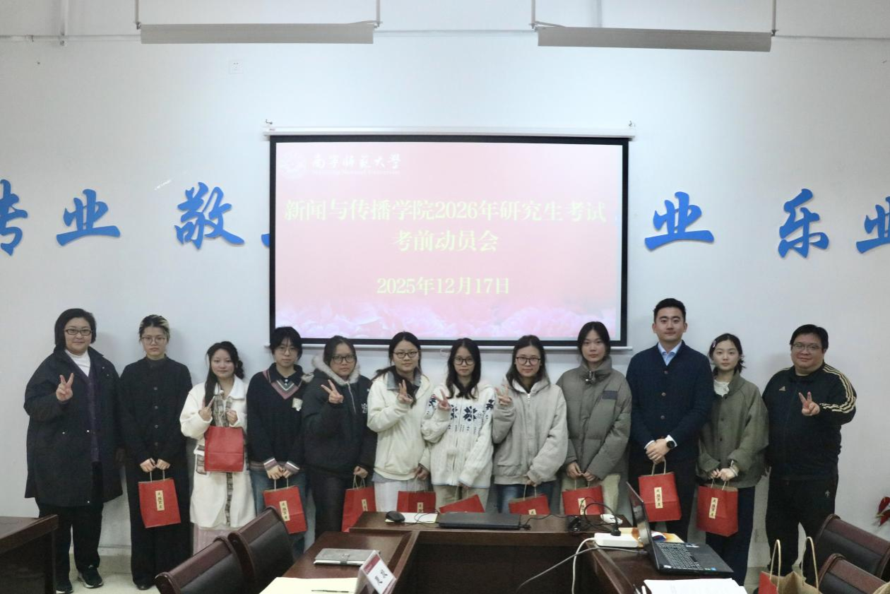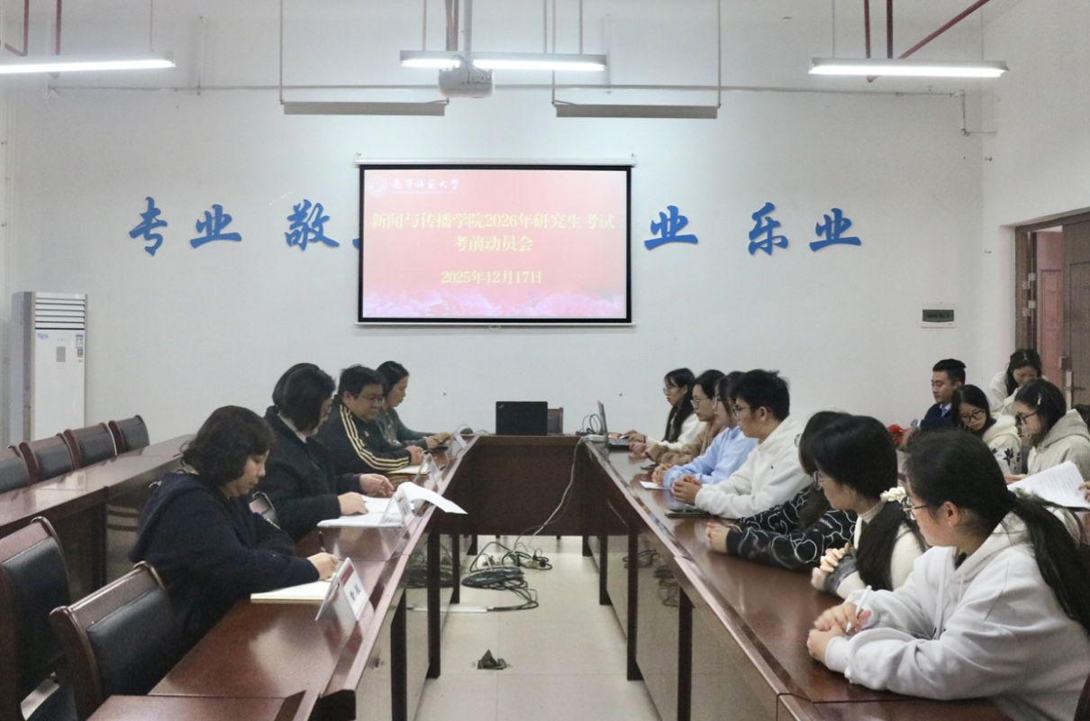 12月17日上午,新闻与传播学院在理综楼304会议室隆重举行2026年研究生考试考前动员会暨诚信教育专项活动。学院党委书记聂卉、院长梁颖涛、党委副书记黄敏以及2022级全体考研学子参加活动。活动由学工办辅导员惠旋主持。