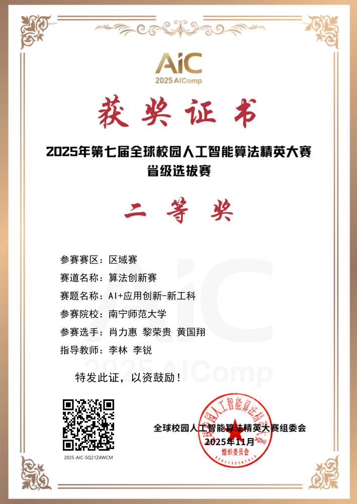 此外,在近期举办的第七届全球校园人工智能算法精英大赛(AIC,A类竞赛)中,肖力惠等同学表现优异,在省级选拔赛中分别获得二等奖和三等奖,并成功晋级全国总决赛,最终荣获国家级优秀奖。