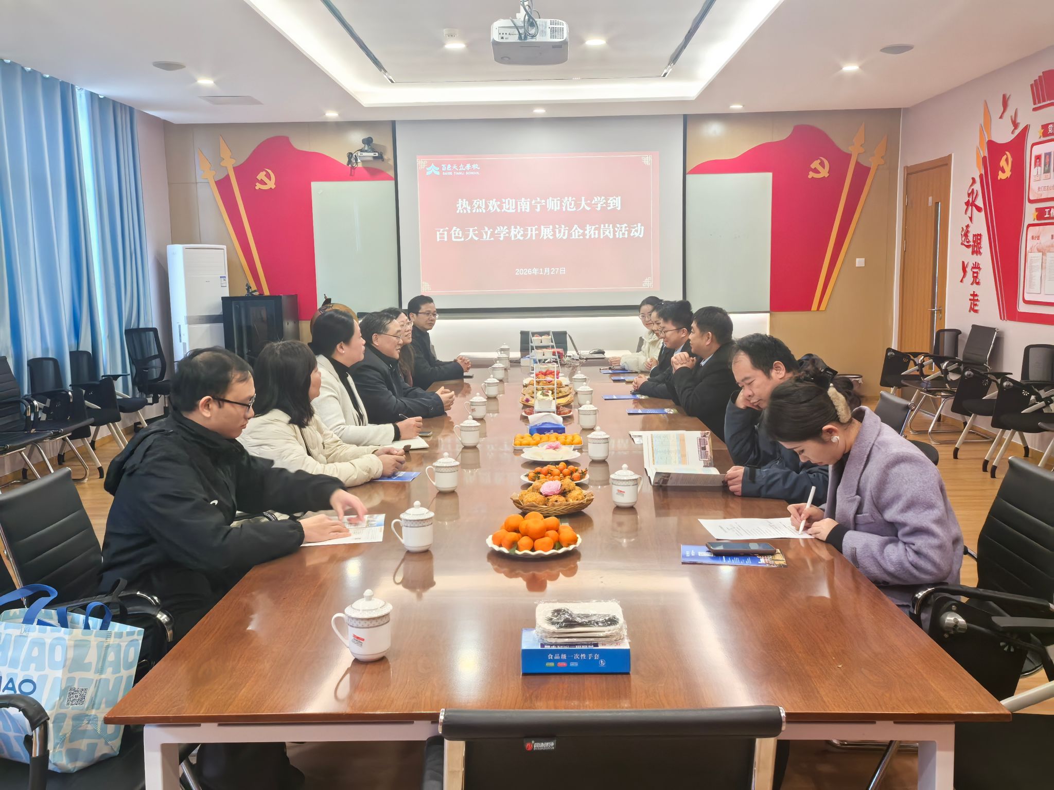 为深入贯彻落实国家关于促进高校毕业生就业创业工作的决策部署,积极应对 2026 届毕业生规模再创新高所带来的机遇与挑战,1 月 27 日,南宁师范大学教育科学学院、马克思主义学院与国际教育学院一行 6 人,前往百色市开展访企拓岗和人才培养专题调研活动。调研组先后走访了多家学校、企业以及百色市教育局,围绕校校合作、校企合作和校地合作等方面展开了深入交流。