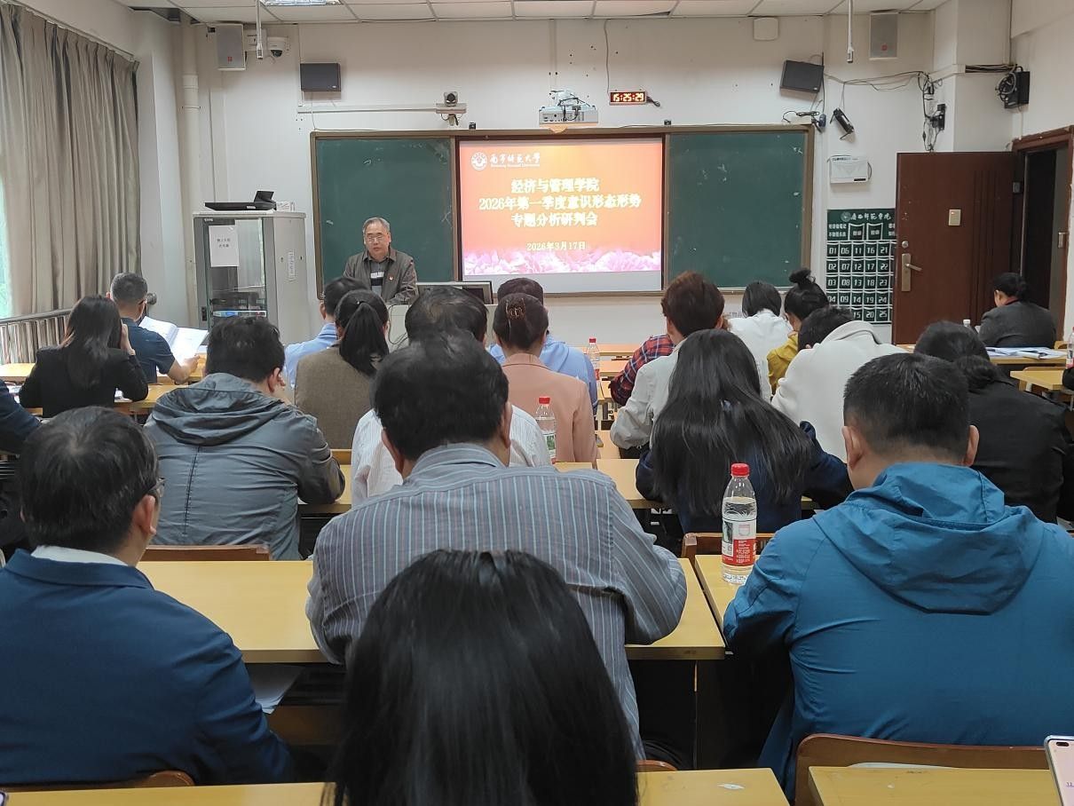 3月17日下午,经济与管理学院在明秀校区文星楼308教室召开2026年第一季度意识形态与安全稳定研判会。学院党委书记韦海鸣主持会议并讲话,全体教职工参会。