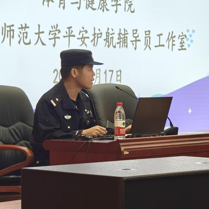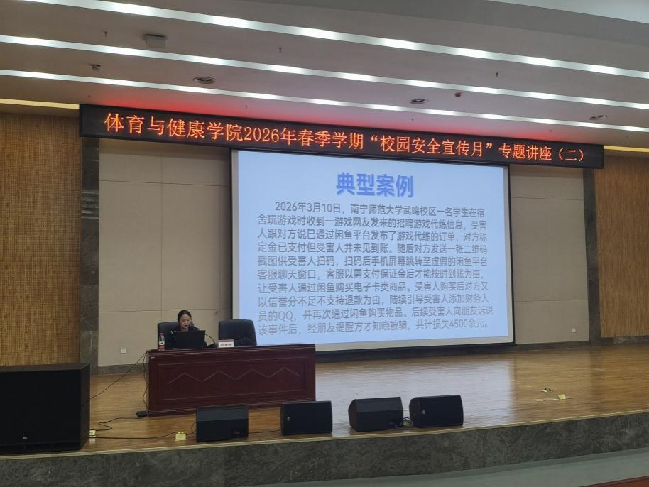 为深入学习宣传贯彻习近平总书记关于安全生产的重要论述,全面落实校园安全管理各项要求,切实提升体育专业学生的安全防范意识和识骗防骗能力,3月17日下午,体育与健康学院2026年春季学期“校园安全宣传月”第二场专题讲座在武鸣校区图书馆报告厅顺利举行。本次讲座由平安护航辅导员工作室、体育与健康学院特邀南宁市公安局武鸣分局反诈中心邓幸梓警官担任主讲,南宁市公安局武鸣分局城镇派出所所长和警员同志,学院教师、辅导员及2023级、2024级本科生共400余人到场学习,现场秩序井然,互动积极。