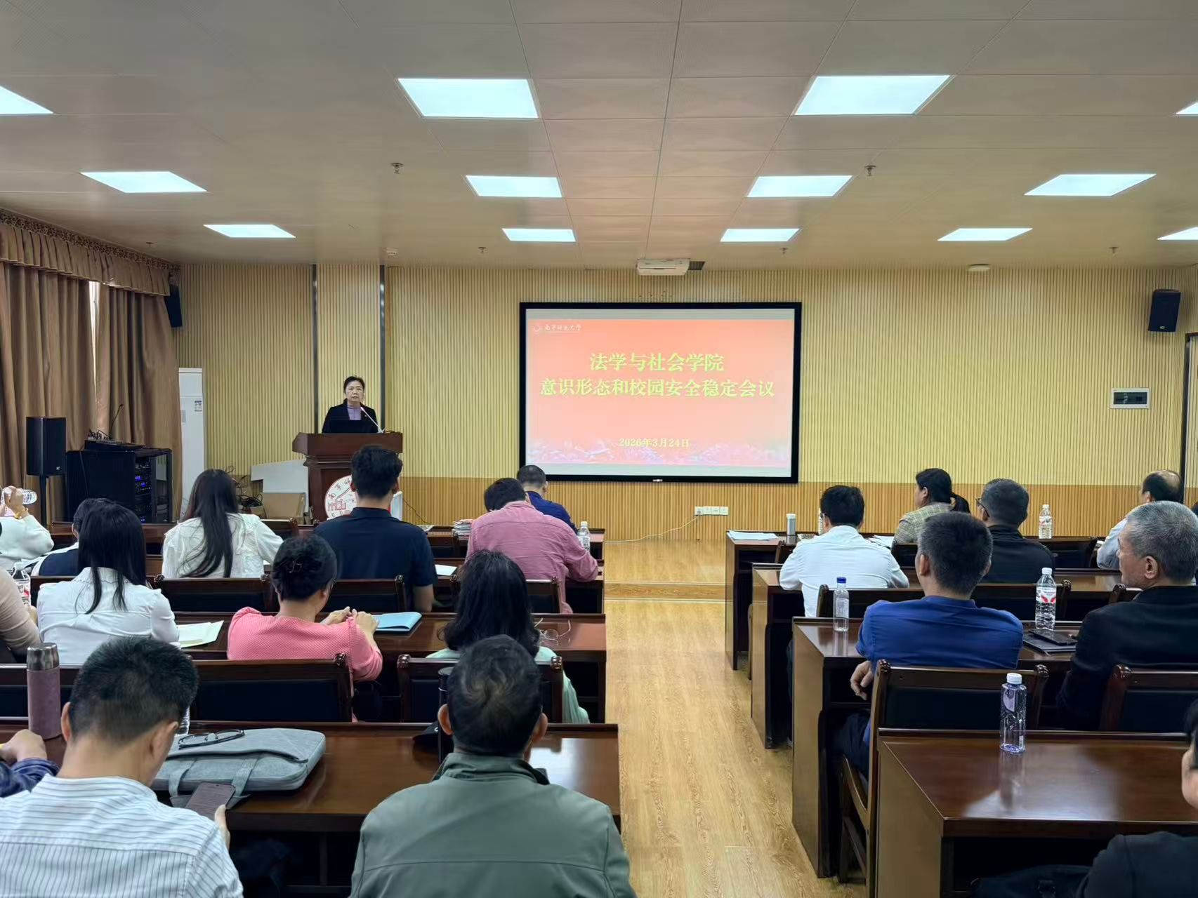 为切实筑牢学院意识形态阵地,守住校园安全稳定底线,3月24日下午,法学与社会学院在五合校区理楼720会议室召开2026年春季学期意识形态和校园安全稳定会,学院全体教职工参加会议,会议由学院党委书记许建主持。