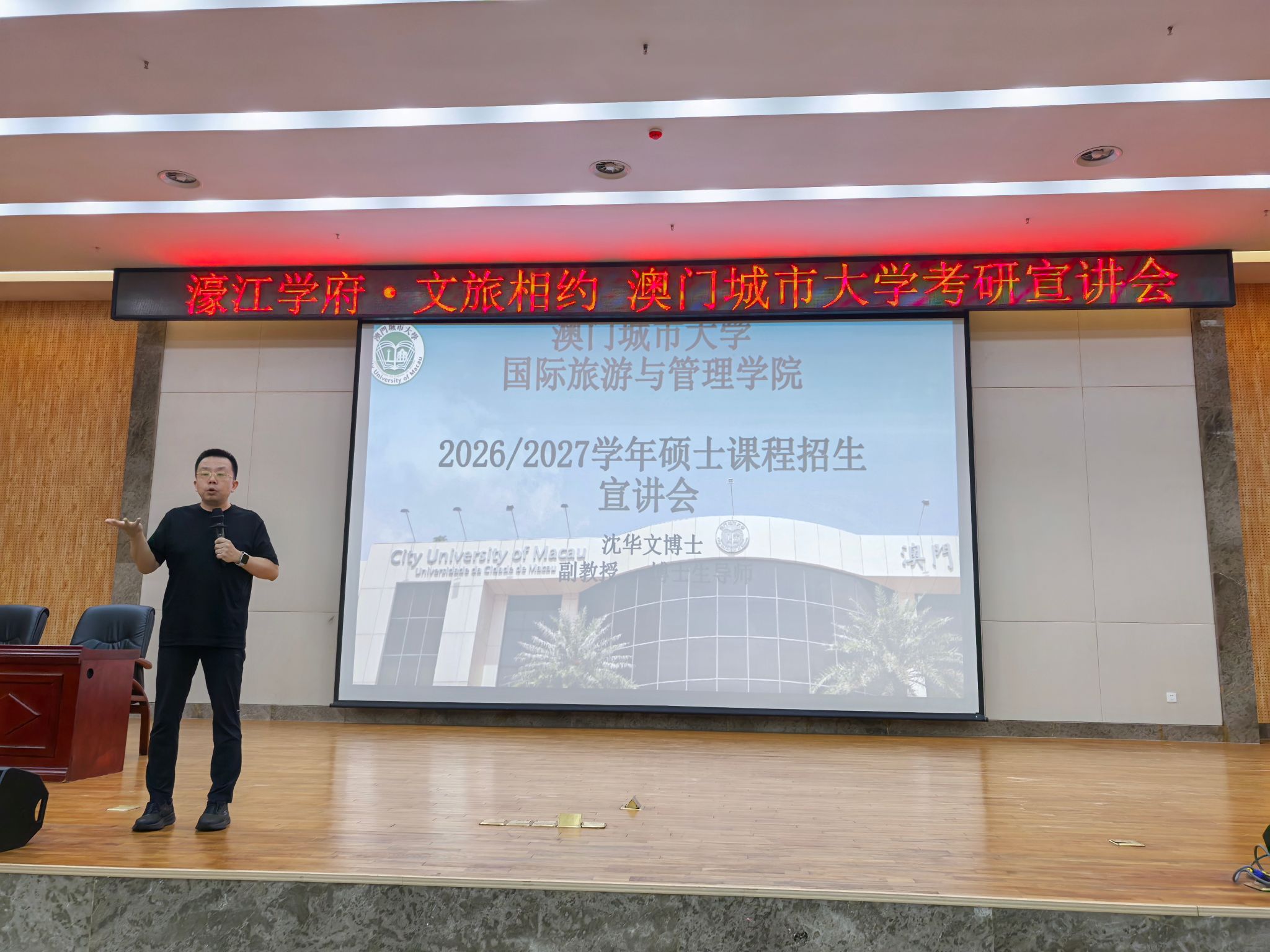 3月26日晚,旅游与文化学院在武鸣校区图书馆报告厅举办考研专题宣讲会。会议诚邀澳门城市大学沈华文副教授、博士生导师主讲,为学生提供权威、全面的境外升学信息。旅游与文化学院400余名师生参加宣讲会,会议由学院党委副书记、纪委书记黄珍主持。
