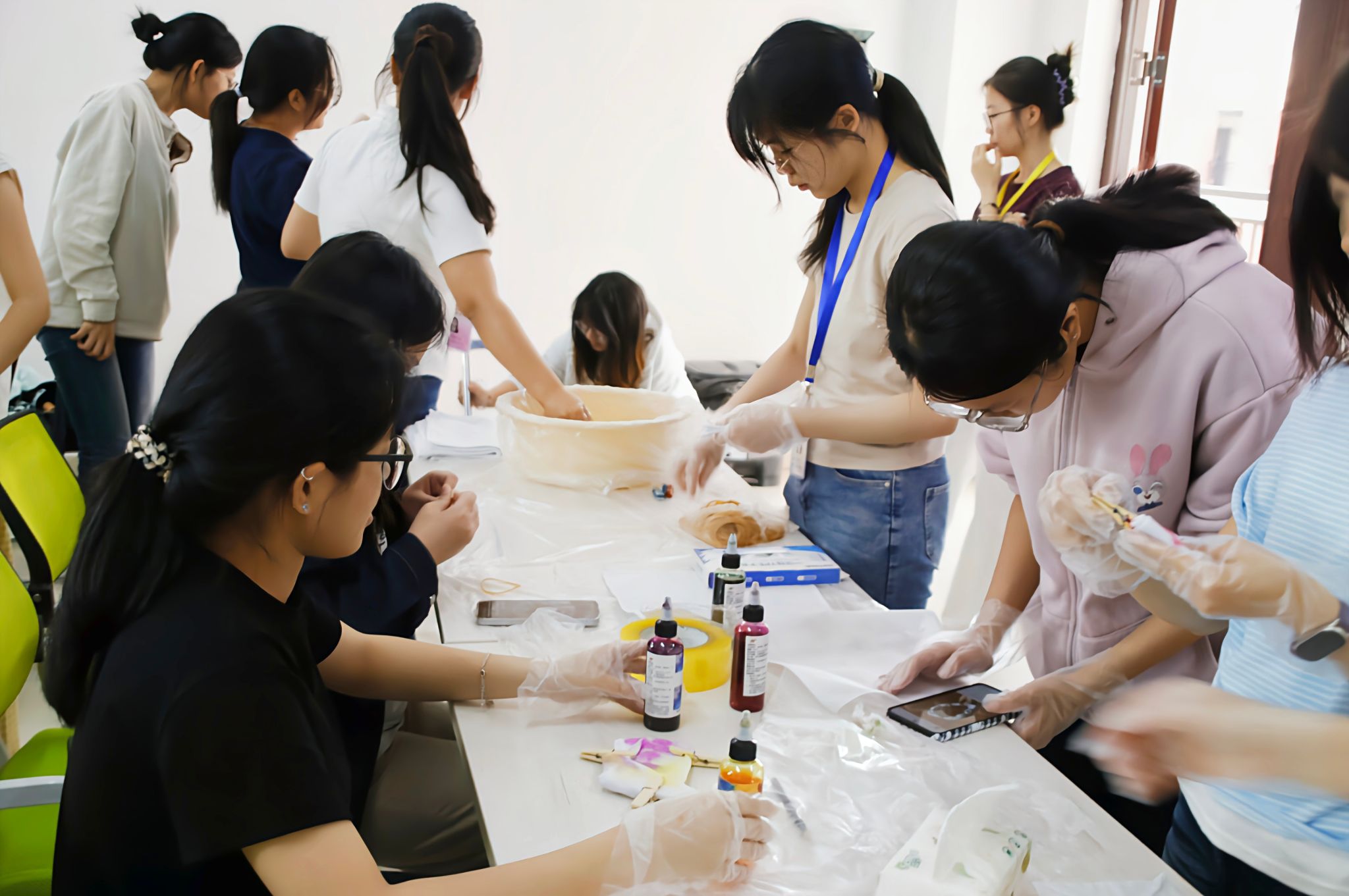 随后,活动进入扎染体验环节。主持人结合现场演示,用英文讲解了扎染工艺中的扎结、染色、晾干三大流程,接着在工作人员的组织下,同学们亲自动手体验,完成各道工序。大家充分发挥创意,制作出独具特色的扎染方巾,现场气氛热烈,作品异彩纷呈。