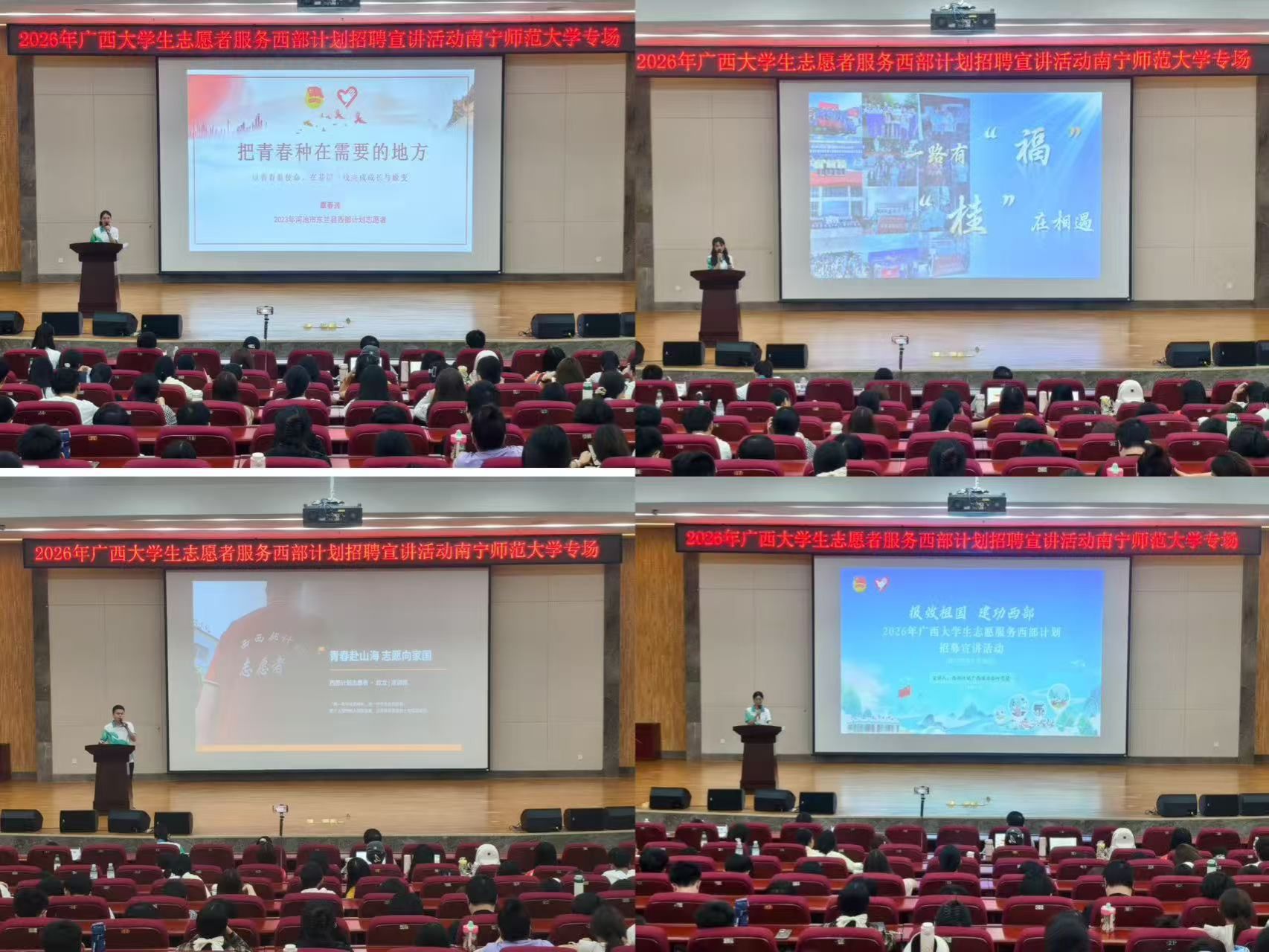 4月13日下午,2026年广西大学生志愿服务西部计划招募宣讲活动在我校明秀、五合、武鸣三个校区同步举行,活动采取线上线下相结合的方式开展。广西西部计划招募宣讲团成员、校团委负责人及各学院师生代表共同参加本次宣讲活动。
