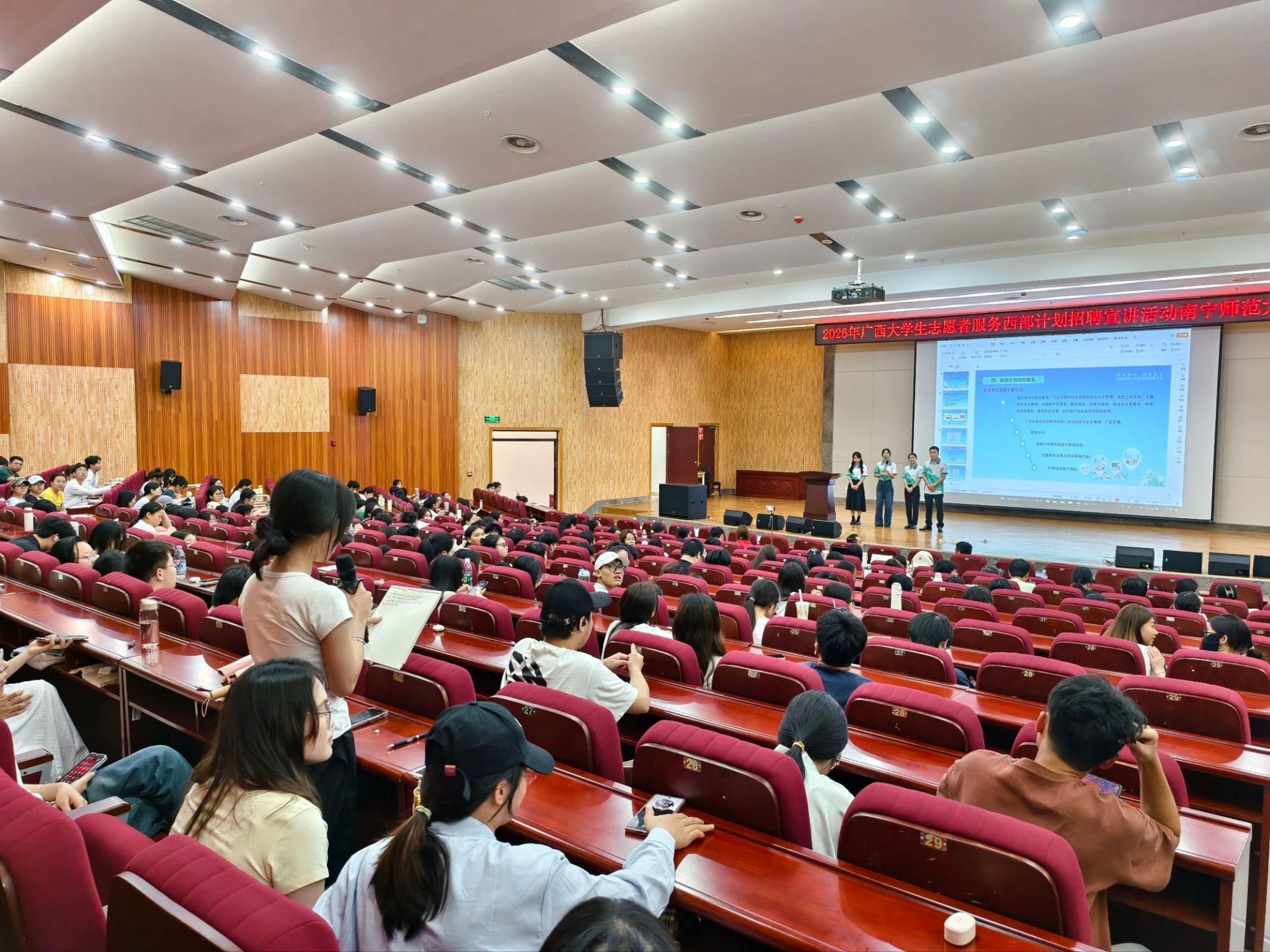 活动现场,覃春莲、张雨铄、欧龙三位西部计划志愿者先后结合自身在乡村教育、乡村建设、基层青年工作等一线岗位的服务经历,生动分享了扎根八桂大地、服务基层群众的成长感悟与奋斗故事,充分展现了新时代西部计划志愿者甘于奉献、勇于担当的青春风采,并向我校青年学子发出诚挚号召,鼓励大家主动到西部去、到基层去、到祖国和人民最需要的地方去施展才华、建功立业。西部计划广西项目办专员叶可荧围绕西部计划招募流程、岗位设置、服务内容及政策保障等方面进行了全面细致的解读。在互动交流环节,宣讲团成员针对岗位选择、地区分配、服务管理、后续职业发展等热点问题,与现场同学深入交流、逐一答疑,进一步加深了同学们对西部计划的认识与理解。