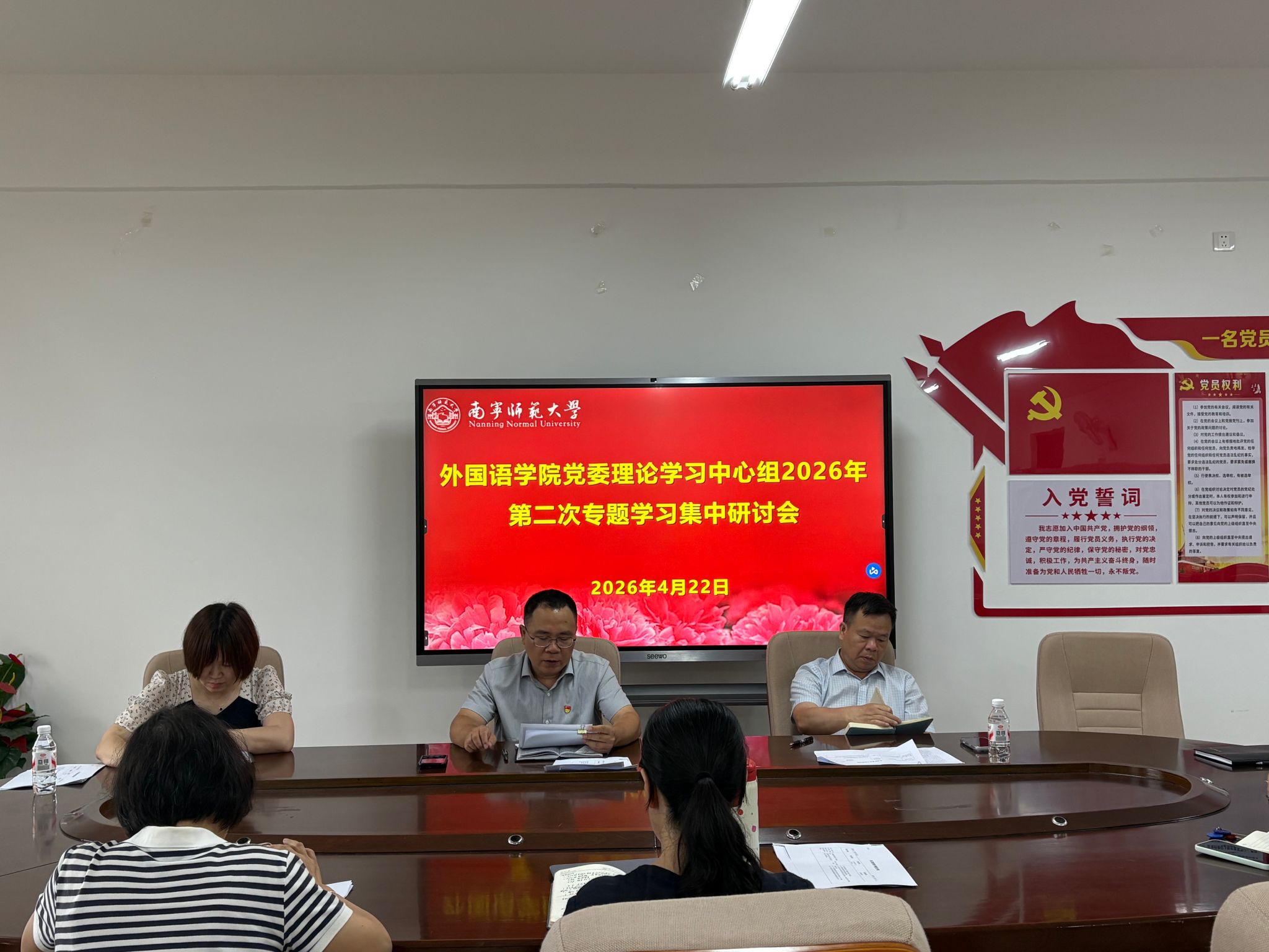4月22日上午,外国语学院党委理论学习中心组在武鸣校区实验教学楼B614召开2026年第二次专题学习集中研讨会。会议由学院党委书记苏华主持,学院党委委员、纪委委员参加会议。