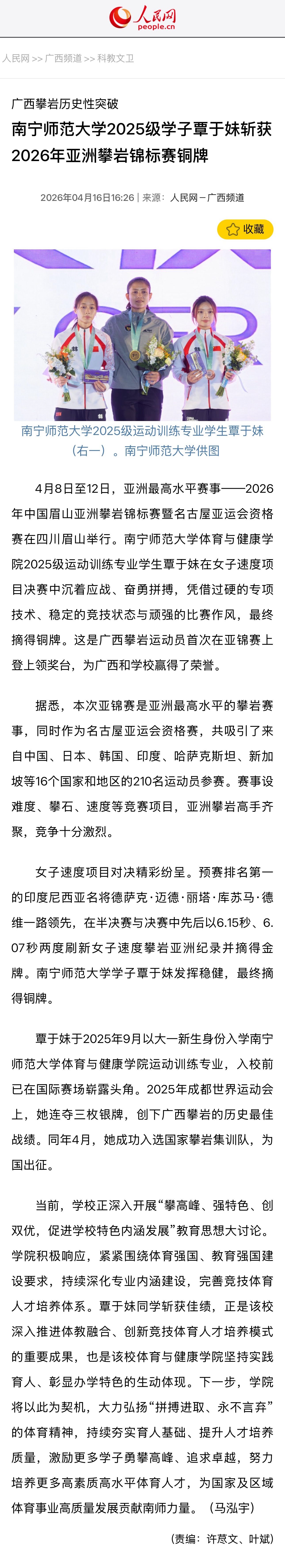 【人民网】南宁师范大学2025级学子覃于妹斩获2026年亚洲攀岩锦标赛铜牌