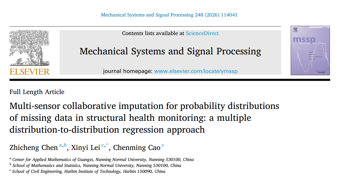 近日,广西应用数学中心(南宁师范大学)骨干教师陈智成博士的论文“Multi-sensor collaborative imputation for probability distributions of missing data in structural health monitoring: a multiple distribution-to-distribution regression approach”在工程机械领域一区Top期刊《Mechanical Systems and Signal Processing》(影响因子8.9)上在线发表。