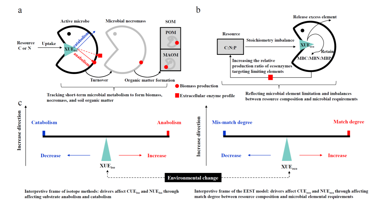 微生物代谢效率是衡量生态系统养分循环、调控土壤碳汇功能的核心关键指标,对揭示全球变化背景下生态系统物质循环规律具有重要意义。目前,同位素法与生态酶化学计量模型是国际上评估微生物代谢效率的两大主导方法,但由于两种方法在代谢效率定义、模型核心假设及研究关注焦点上存在本质差异,导致研究者在解读实验数据时,常面临生态意义模糊、不同方法结果难以互证等问题。