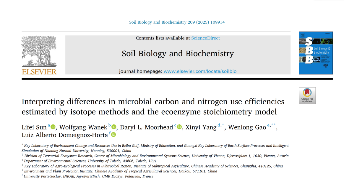 近期,我校地理与海洋研究院孙立飞副研究员在微生物代谢效率评估方法研究领域取得新进展,相关研究成果以“Interpreting differences in microbial carbon and nitrogen use efficiencies estimated by isotope methods and the ecoenzyme stoichiometry model”为题,在土壤学专业国际顶级期刊Soil Biology and Biochemistry(中国科学院一区TOP期刊,2025年影响因子10.3)在线发表。该论文第一完成单位为北部湾环境演变与资源利用教育部重点实验室,孙立飞副研究员为论文第一作者。