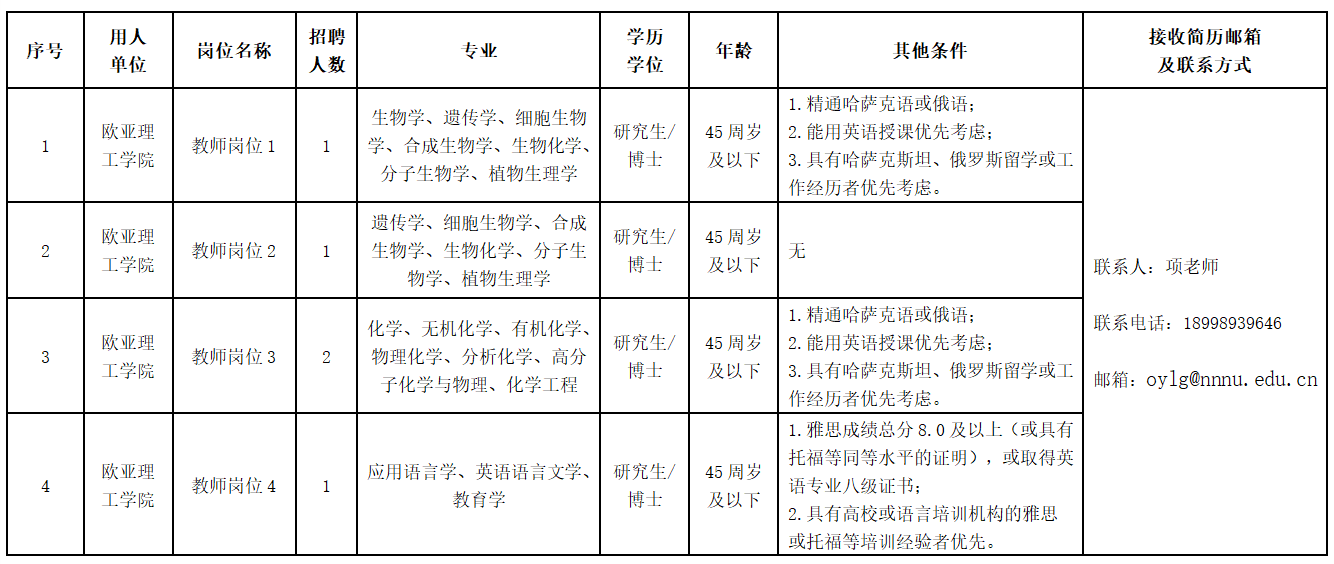 2025年5月,教育部正式批复同意我校与哈萨克斯坦欧亚国立大学合作举办非独立法人中外合作办学机构—南宁师范大学欧亚理工学院。欧亚理工学院以服务“一带一路”倡议和中哈命运共同体建设为使命,旨在充分发挥中哈两校优质教育资源,面向生物科学、化学及应用化学领域,培养具有扎实学科理论基础、创新实践能力及国际化视野的高素质复合型人才。现根据欧亚理工学院发展需要,面向海内外招聘优秀博士人才。