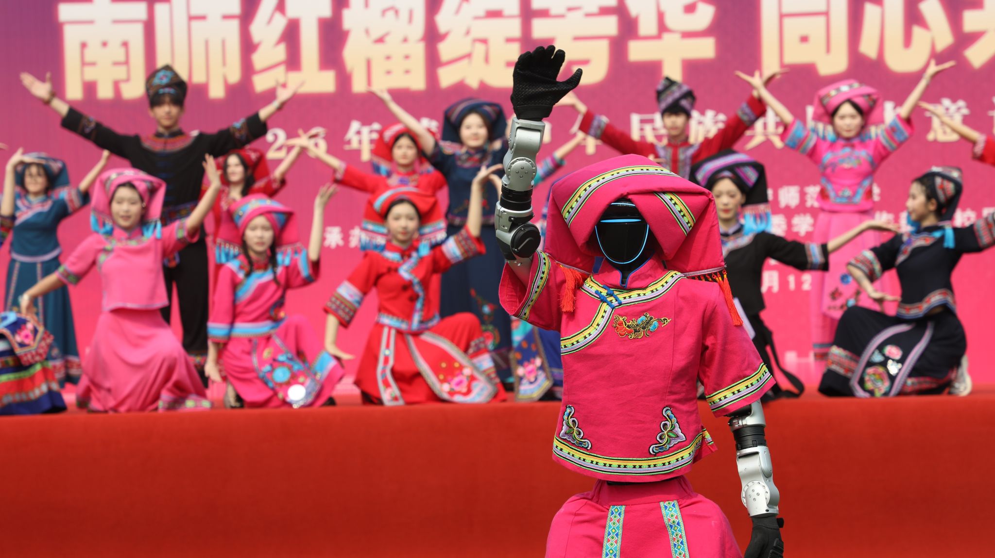 启动仪式现场氛围热烈、亮点纷呈。身着壮族节日盛装的智能机器人“小小刘三姐”惊艳亮相并联动表演,从客串礼仪到尽情舞蹈,一举一动尽显AI科技与民族文化交融之美;可爱喜庆的团属“犇犇”憨态可掬,与现场师生亲切互动、合影留念,瞬间点燃全场欢乐氛围。歌舞走秀《大地飞歌》气势磅礴,山歌对唱《蝉虫歌》《邕宁敬酒歌》宛转悠扬,民族舞蹈联欢《广西尼的呀》灵动欢快,师生同台欢歌载舞,生动诠释了各民族文化交融共生、美美与共的美好图景。