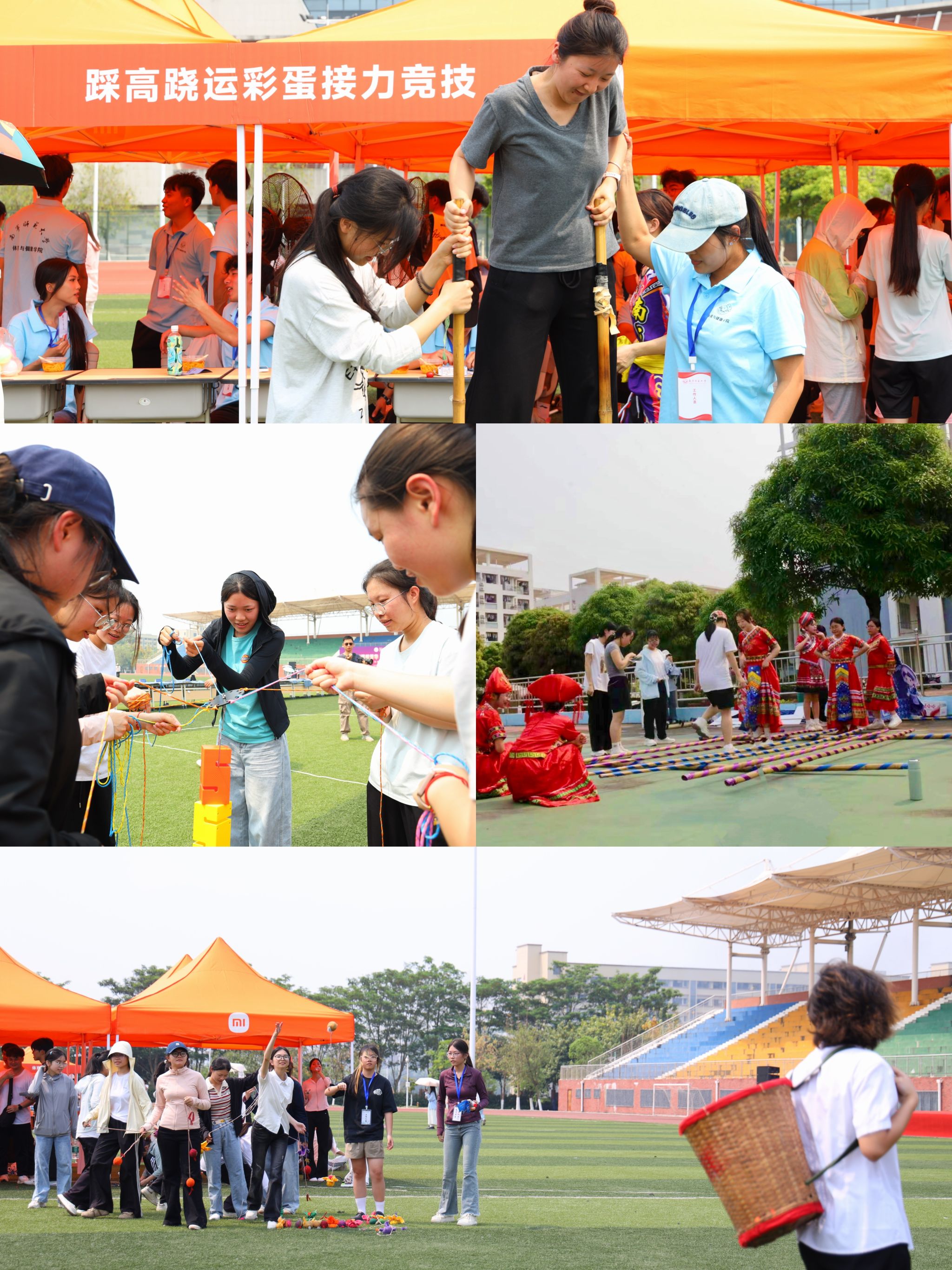 活动现场的互动体验区更是热闹非凡、趣味十足。民族非遗风情展示馆内,一件件精美的非遗展品整齐陈列,吸引着师生们驻足观赏、细细品味;民族手工青创市集的手工编织、植物拓染、刺绣等摊位前,师生们亲手制作,感受非遗技艺的匠心与温度;民族趣味运动会上,绣球投福接力、竹竿舞拼图接力、合力珠宝塔等项目一字排开,大家在协作互动中释放活力,感受传统体育乐趣;民族同心宴更是人头攒动,22个学院精心摆盘的簸箕宴整齐排列,五色糯米饭、艾草糍粑、豆腐酿等广西特色美食香气扑鼻。此外,22个学院还开设了“非遗剪纸与书法体验”“绣球DIY”“壮药香囊手作”等铸牢中华民族共同体意识系列公开课。整场活动中,师生们尽情欢歌、尽情体验,在沉浸式参与中触摸文化脉搏,在互动式体验中增进情感认同,在欢声笑语中凝聚团结力量,进一步推动铸牢中华民族共同体意识融入校园生活、根植师生心田。
